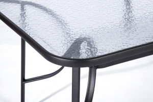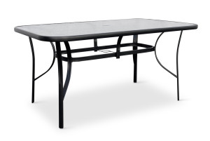 Sestava zahrnuje stabilní stůl s kovovou konstrukcí z oceli a skleněnou transparentní deskou. Deska stolu vyrobená z tvrzeného skla disponuje otvorem pro slunečník o průměru 4,5 cm. Stůl dodáváme včetně plastové záslepky pro případ, kdy otvor pro slunečník nebudete využívat. Kovové části stolu byly ošetřeny proti rzi. Praktický stůl z téměř bezúdržbových omyvatelných materiálů, který svým jednoduchým univerzálním designem zapadne do všech venkovních prostor.