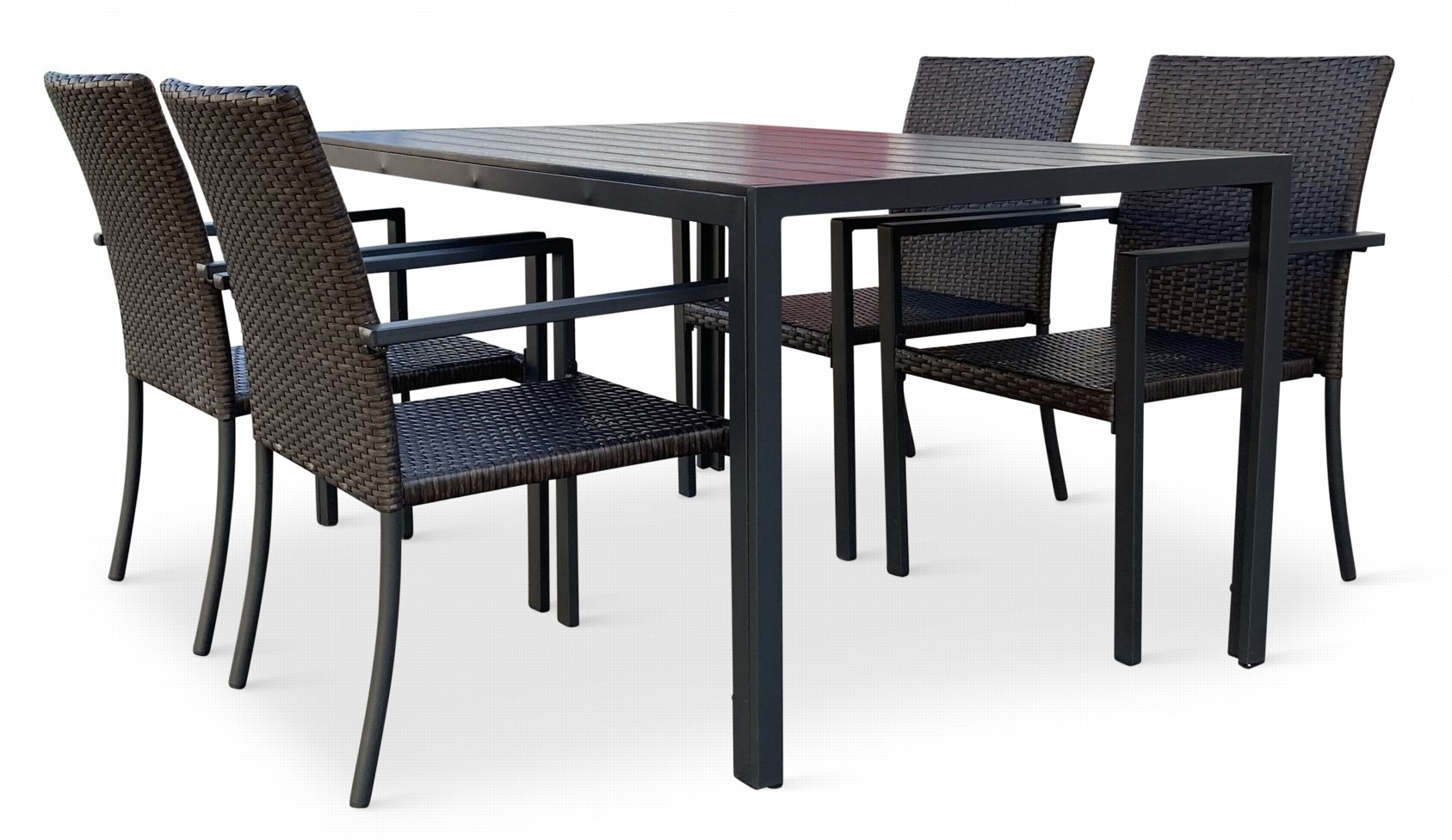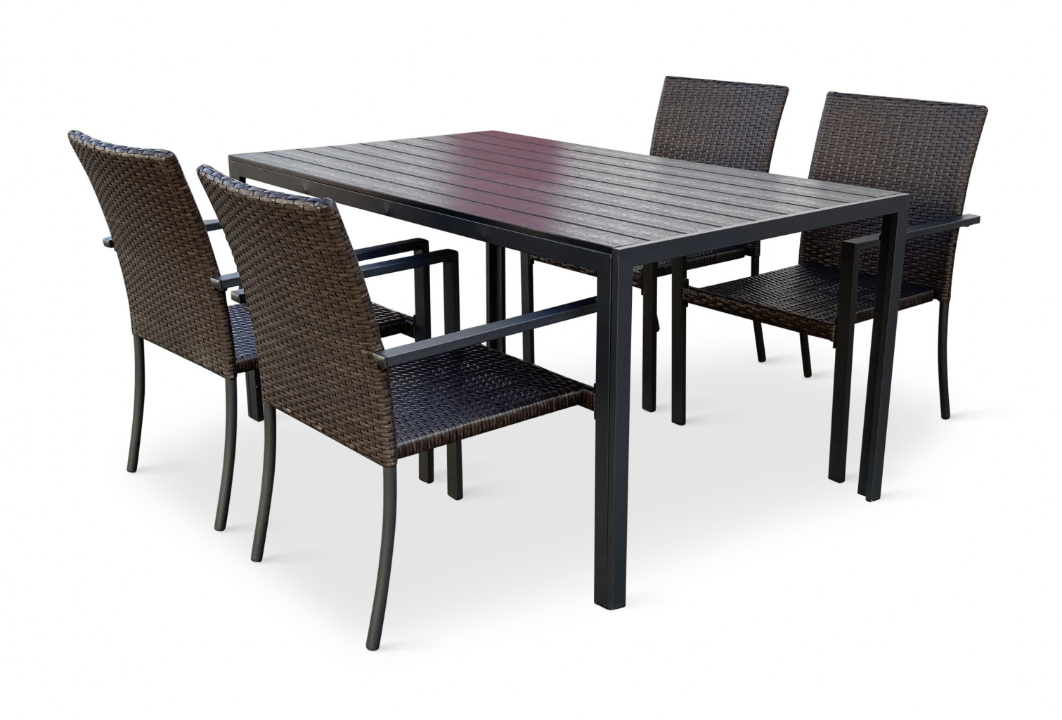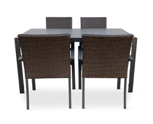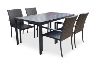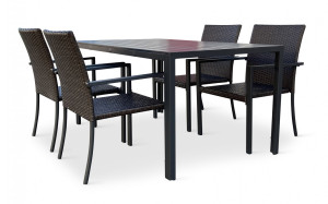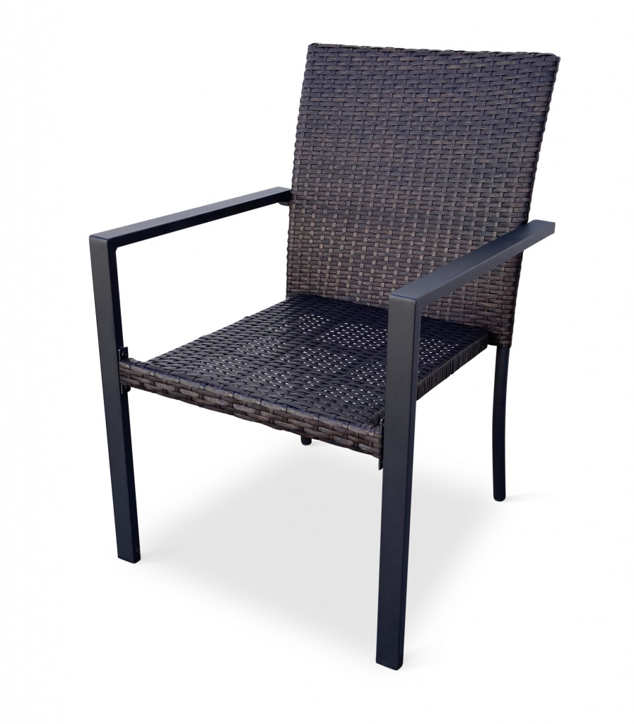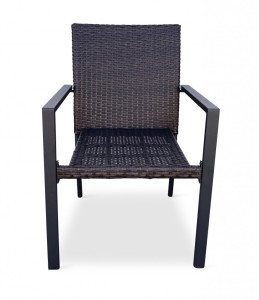 Jídelní stůl doplňují kvalitní zahradní židle s ocelovou konstrukcí vypletenou umělým ratanem. Sedák a opěrku z umělého ratanu v tmavě hnědé barvě doplňují hranaté područky z kovu. Umělý ratan představuje velmi odolný materiál, který dobře snáší jakékoliv povětrnostní podmínky. Na slunci se nevyšisuje a po dlouhou dobu si uchovává svůj vzhled. Pro delší životnost byla ocelová konstrukce židle ošetřena proti rzi. Židle disponuje největším sedákem v kategorii zahradních židlí z umělého ratanu s velkorysými rozměry 49 x 48 cm. Hloubka sedáku je 49 cm a šířka mezi područkami 48 cm. Stohovatelná, téměř bezúdržbová židle s vyztuženým sedákem, který unese těžší váhy i po delší dobu.
