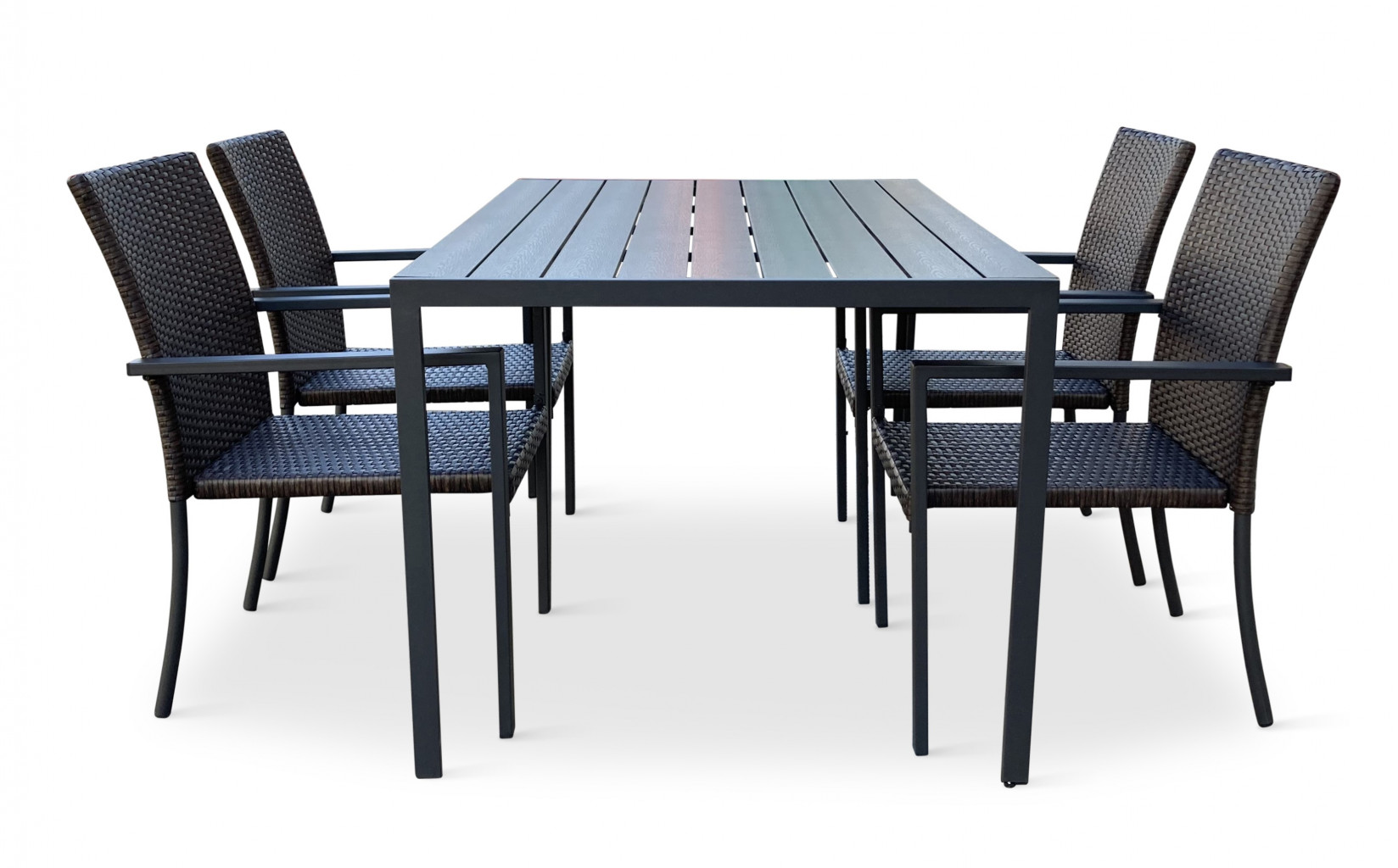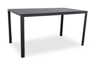 Sestava zahrnuje krásný a lehký stůl vyrobený z materiálů, které nevyžadují zvláštní údržbu. Konstrukce z hliníku ošetřeného proti rzi, deska stolu z artwoodu a adaptéry u nohou pro větší stabilitu. Umělé dřevo artwood v černé barvě věrně imituje strukturu a vzhled dřeva. Ani po několika sezónách neztratí svůj původní vzhled a stabilitu. Klasické tvary a černé provedení stolu.