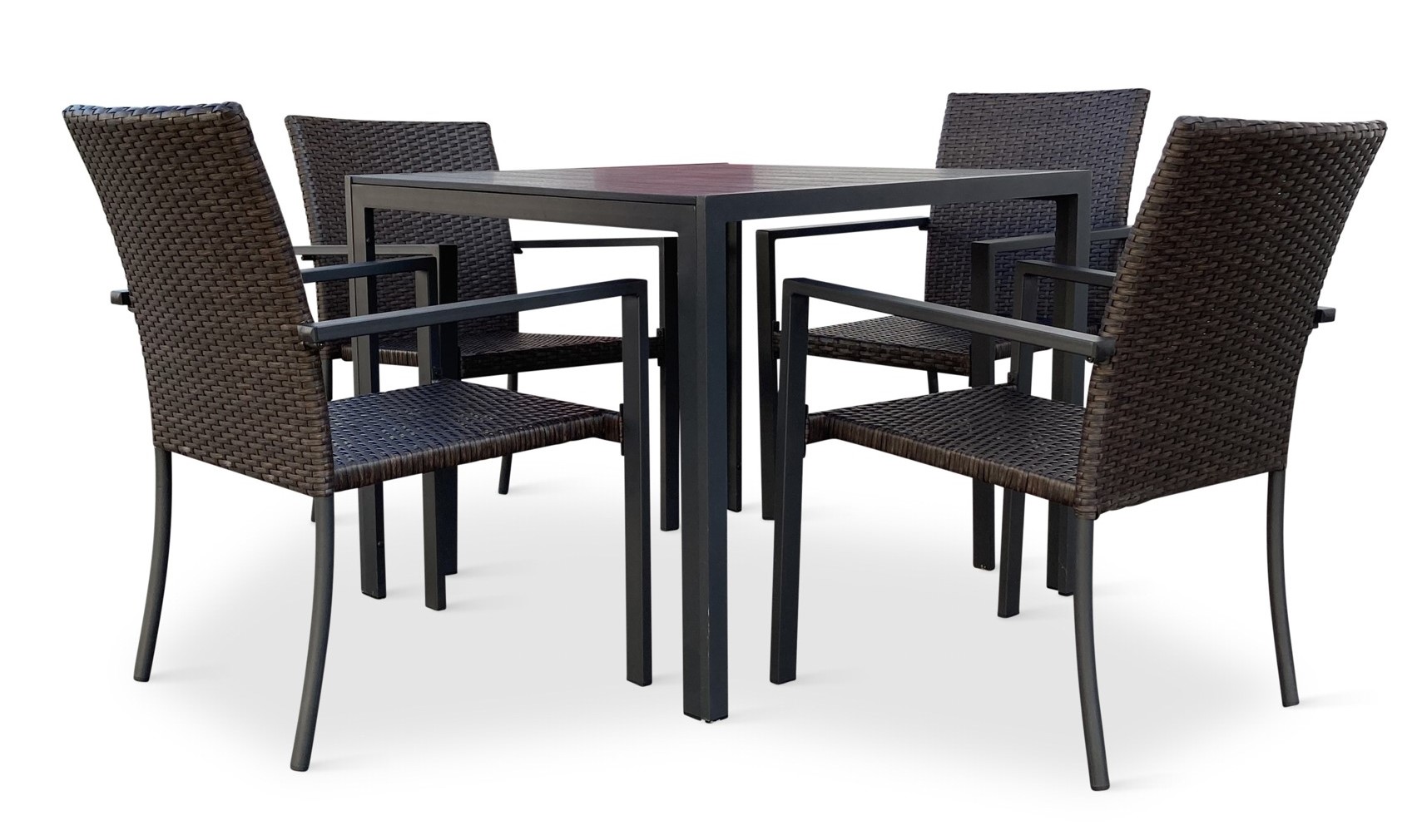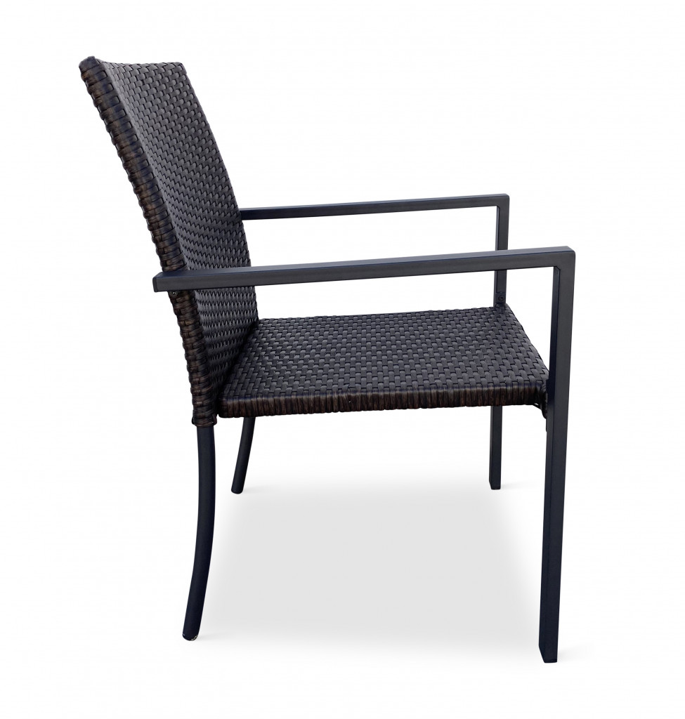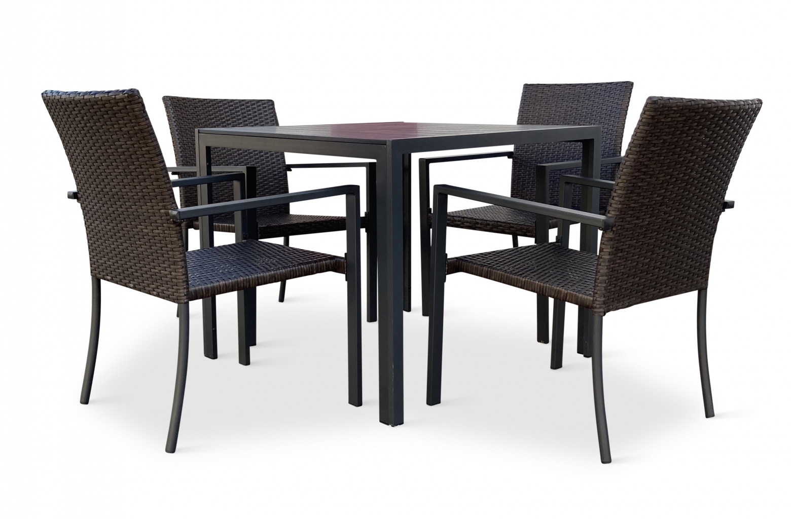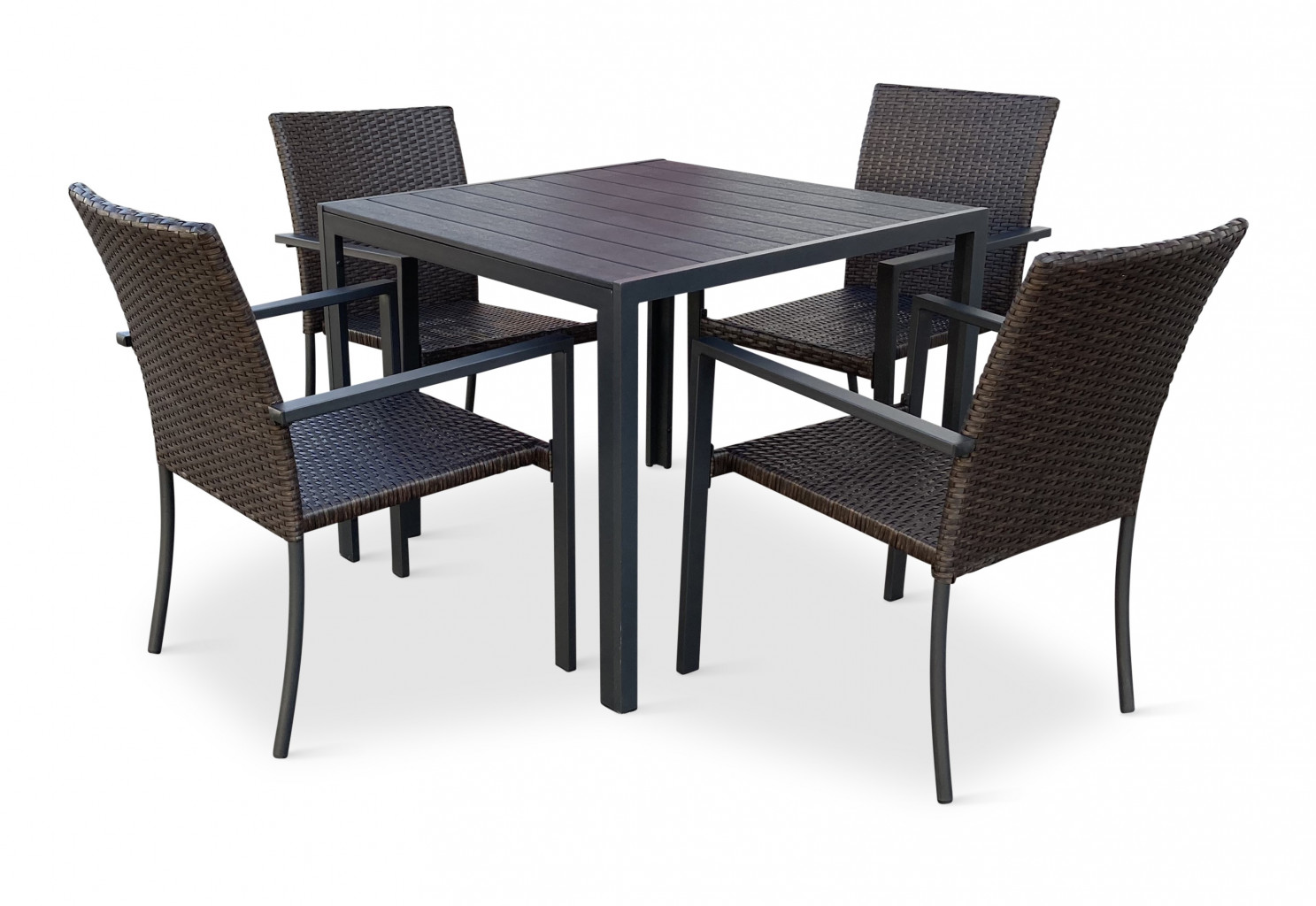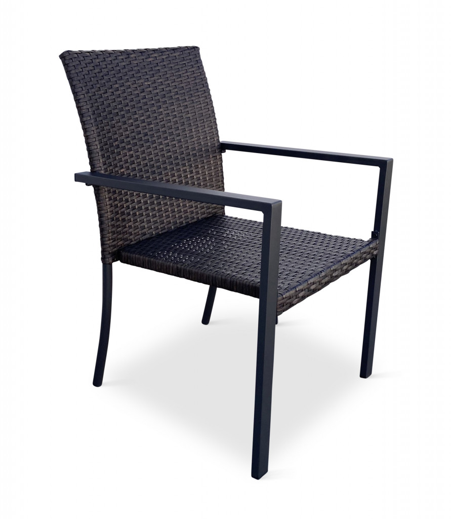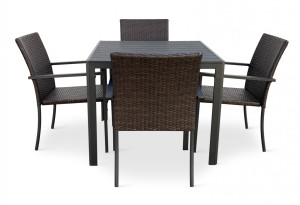 Jídelní stůl doplňují kvalitní zahradní židle s ocelovou konstrukcí vypletenou umělým ratanem. Sedák a opěrku z umělého ratanu v tmavě hnědé barvě doplňují hranaté područky z kovu. Umělý ratan představuje velmi odolný materiál, který dobře snáší jakékoliv povětrnostní podmínky. Na slunci se nevyšisuje a po dlouhou dobu si uchovává svůj vzhled. Pro delší životnost byla ocelová konstrukce židle ošetřena proti rzi. Židle disponuje největším sedákem v kategorii zahradních židlí z umělého ratanu s velkorysými rozměry 49 x 48 cm. Hloubka sedáku je 49 cm a šířka mezi područkami 48 cm. Stohovatelná, téměř bezúdržbová židle s vyztuženým sedákem, který unese těžší váhy i po delší dobu.