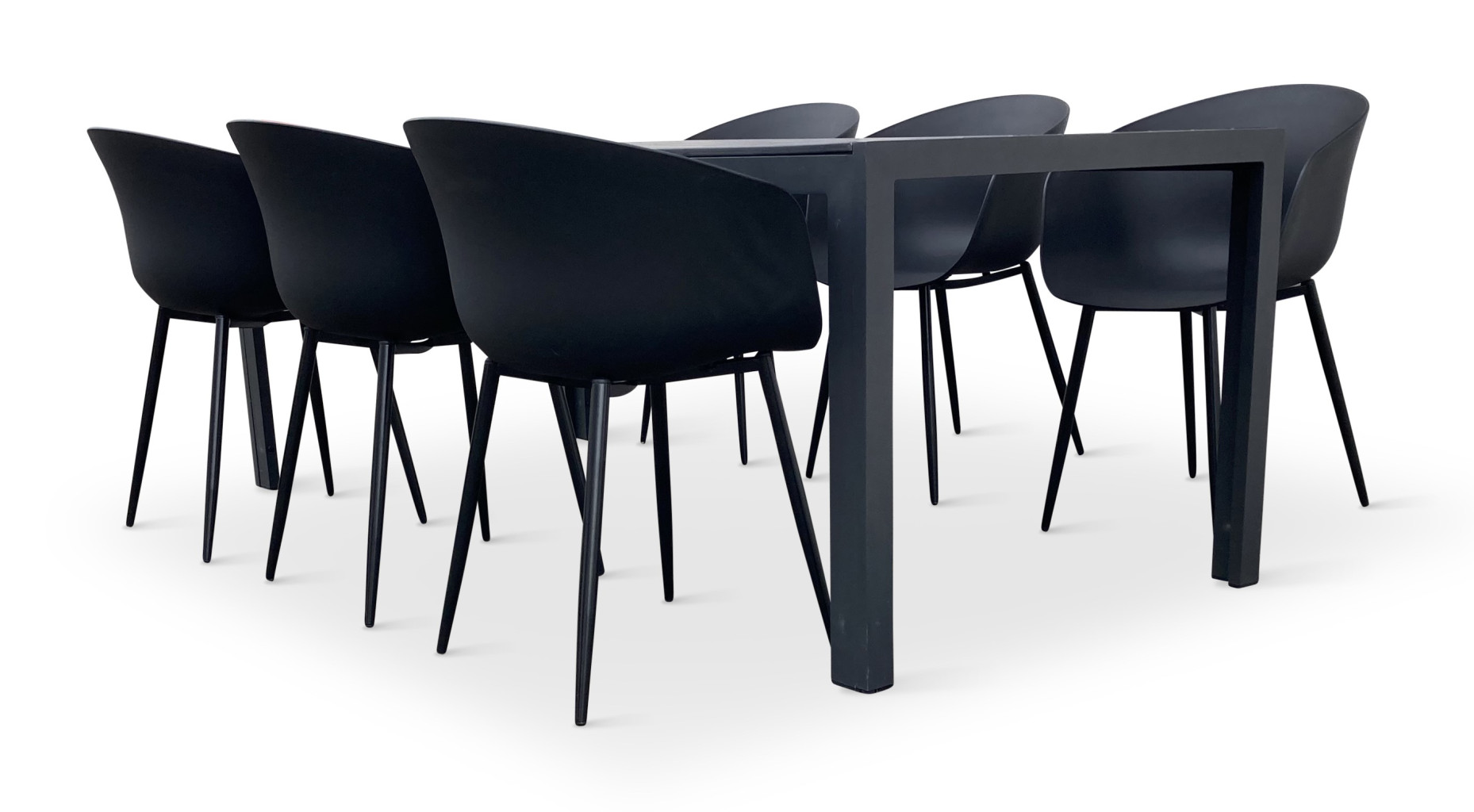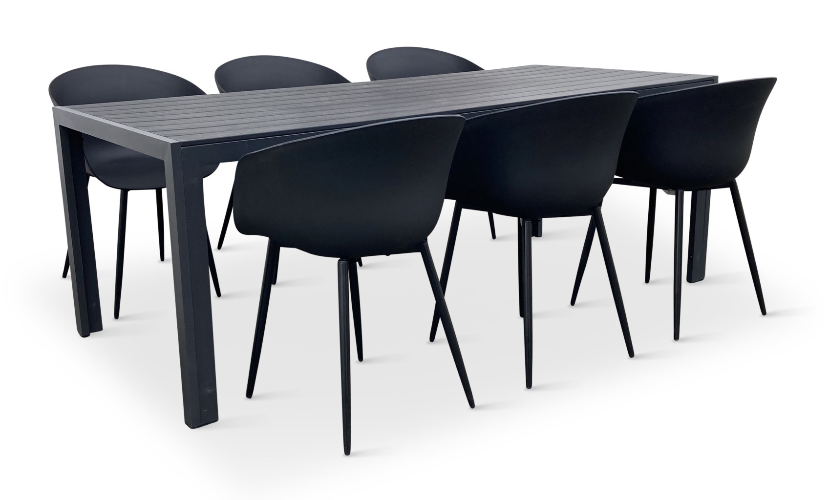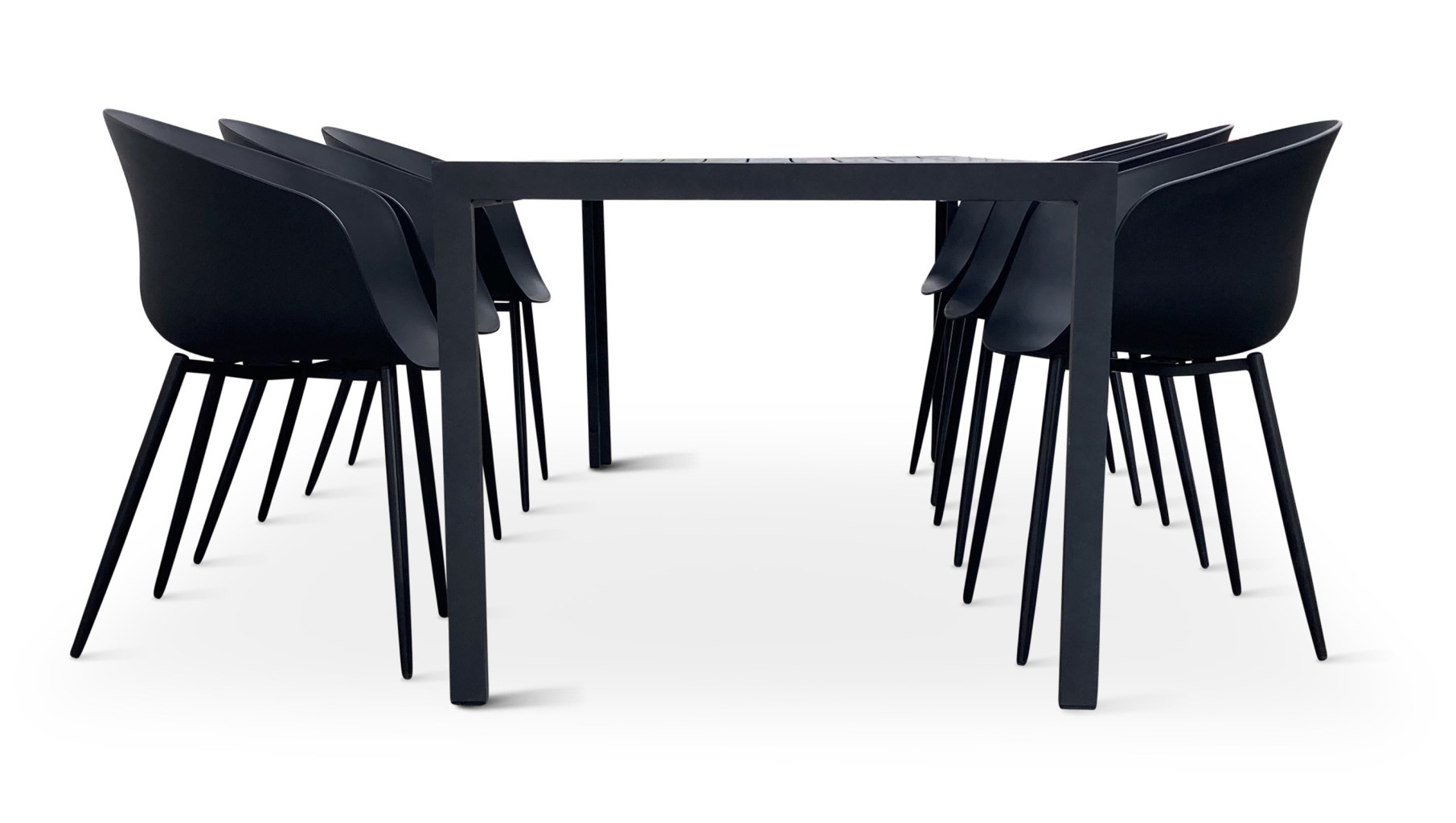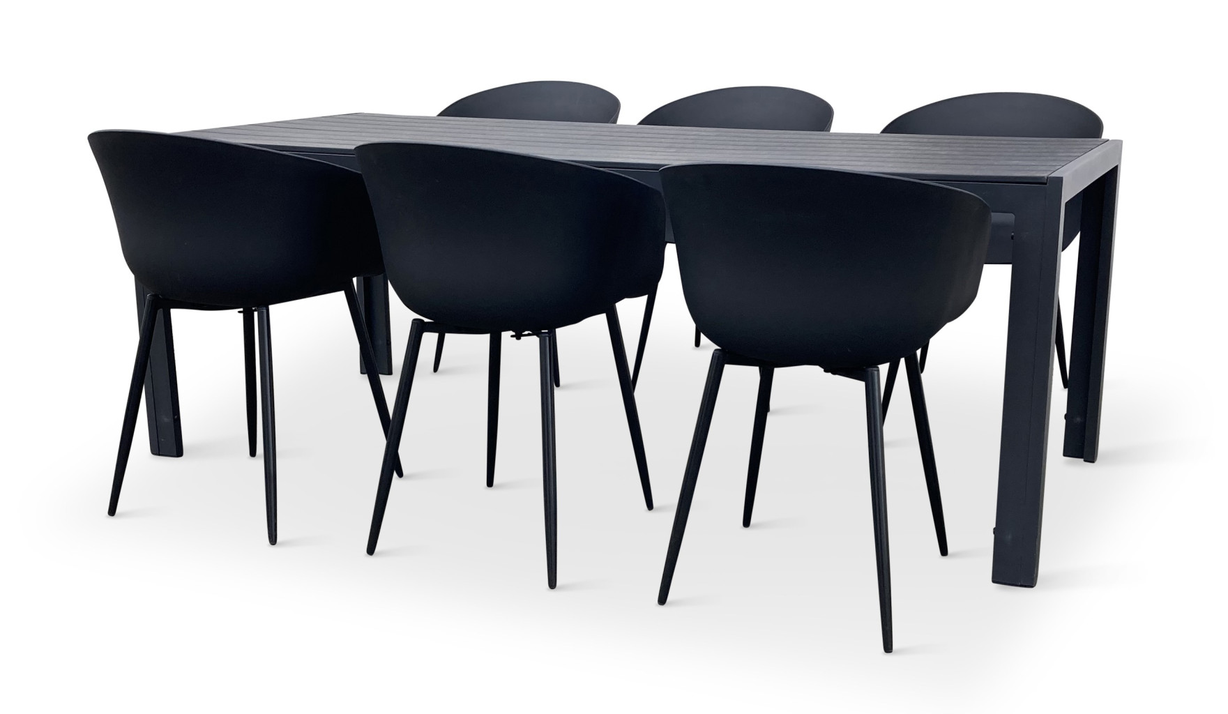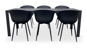 Sestava zahrnuje krásný a lehký stůl vyrobený z materiálů, které nevyžadují zvláštní údržbu. Konstrukce z hliníku ošetřeného proti rzi, deska stolu z artwoodu a adaptéry u nohou pro větší stabilitu. Umělé dřevo artwood v černé barvě věrně imituje strukturu a vzhled dřeva. Ani po několika sezónách neztratí svůj původní vzhled a stabilitu. Klasické tvary a černé provedení stolu.
