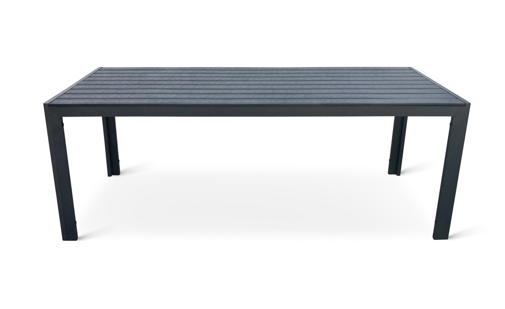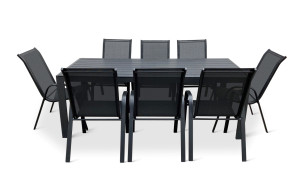 Sestava zahrnuje krásný a lehký stůl vyrobený z materiálů, které nevyžadují zvláštní údržbu. Konstrukce z hliníku ošetřeného proti rzi, deska stolu z artwoodu a adaptéry u nohou pro větší stabilitu. Umělé dřevo artwood v černé barvě věrně imituje strukturu a vzhled dřeva. Ani po několika sezónách neztratí svůj původní vzhled a stabilitu. Klasické tvary a černé provedení stolu.
