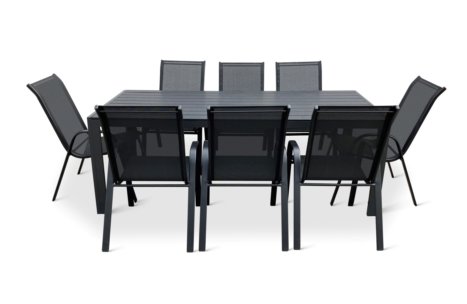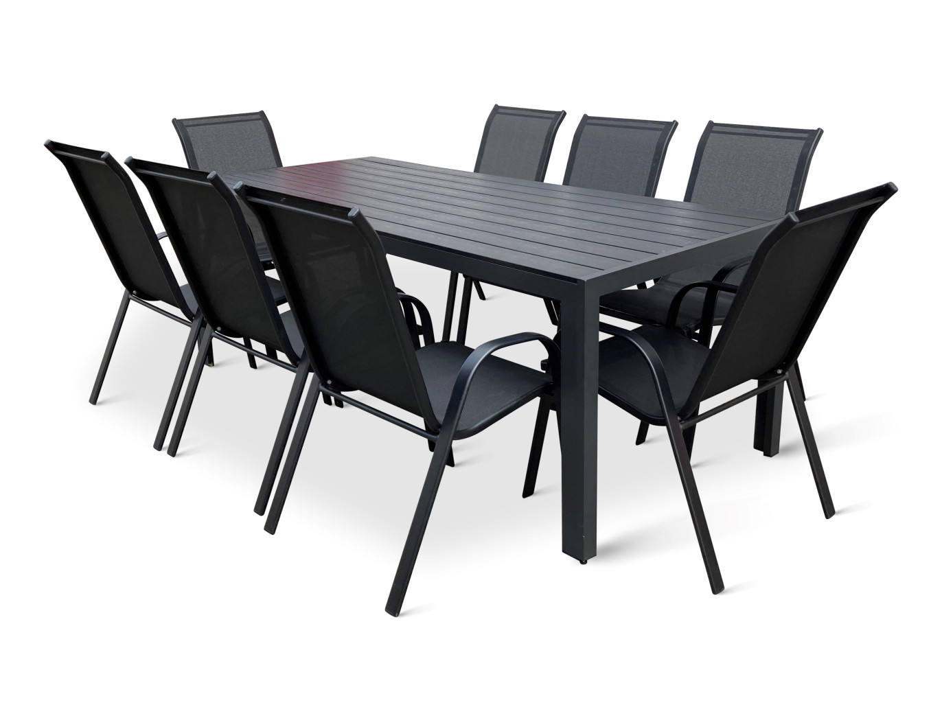 Jídelní stůl doplňují odolné stohovatelné židle s ocelovou konstrukcí a vzdušnou textilií. Vzdušná textilie, ze které je vyroben sedák, je ideální na léto a díky inteligentnímu tvarování velice pohodlná. Židle lze jednoduše naskládat na sebe a nezaberou vám mnoho místa při uložení. Vhodná pro nekomerční použití. Pro delší životnost neskladovat židle ve vlhkých prostorách a nenechávat na dešti.