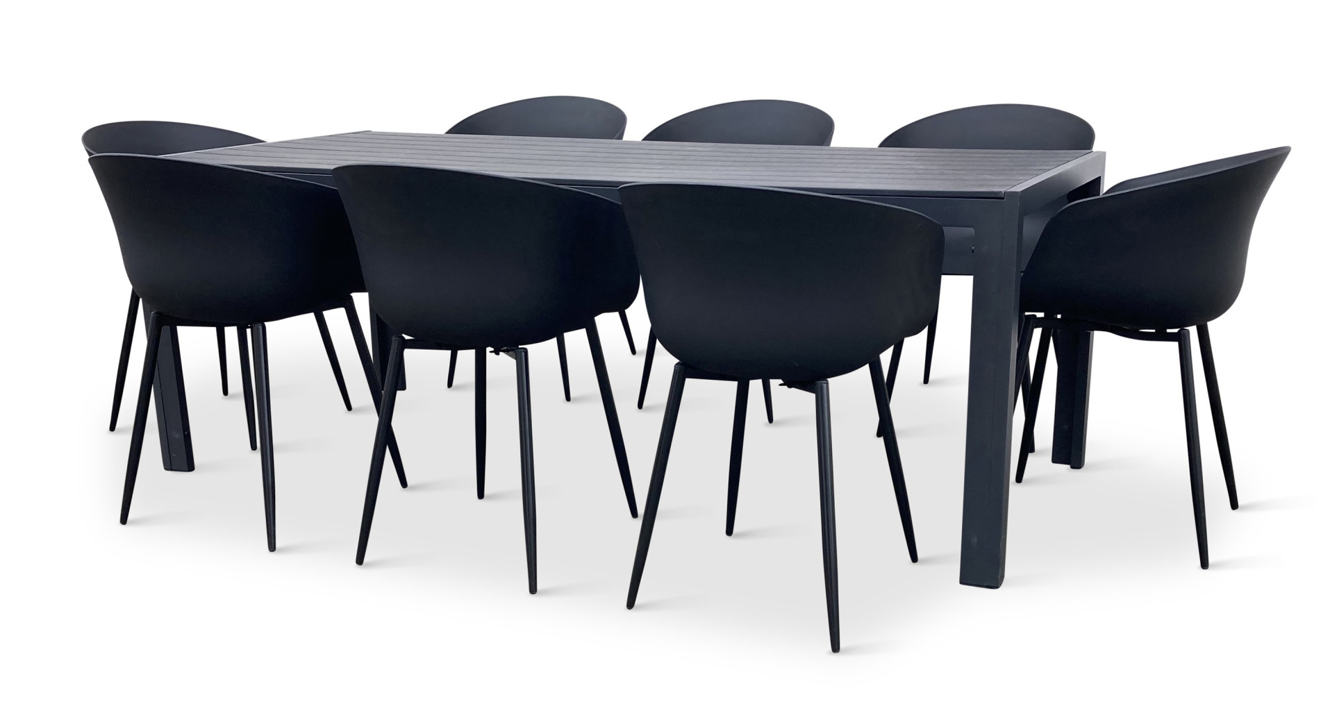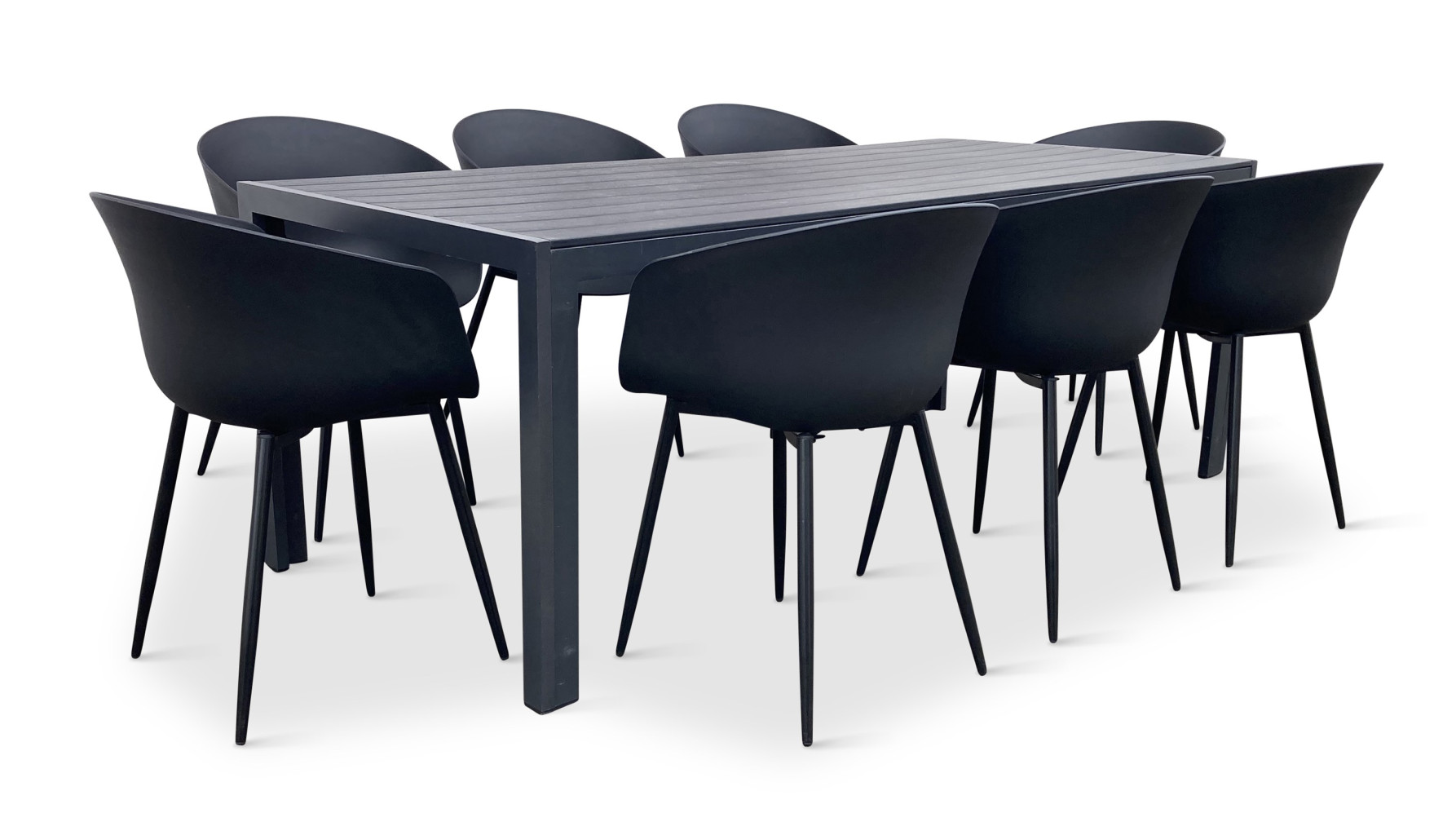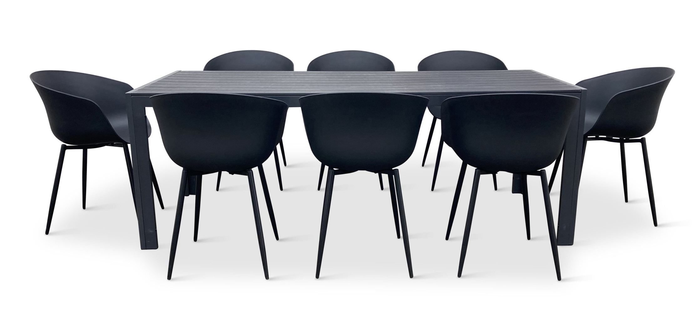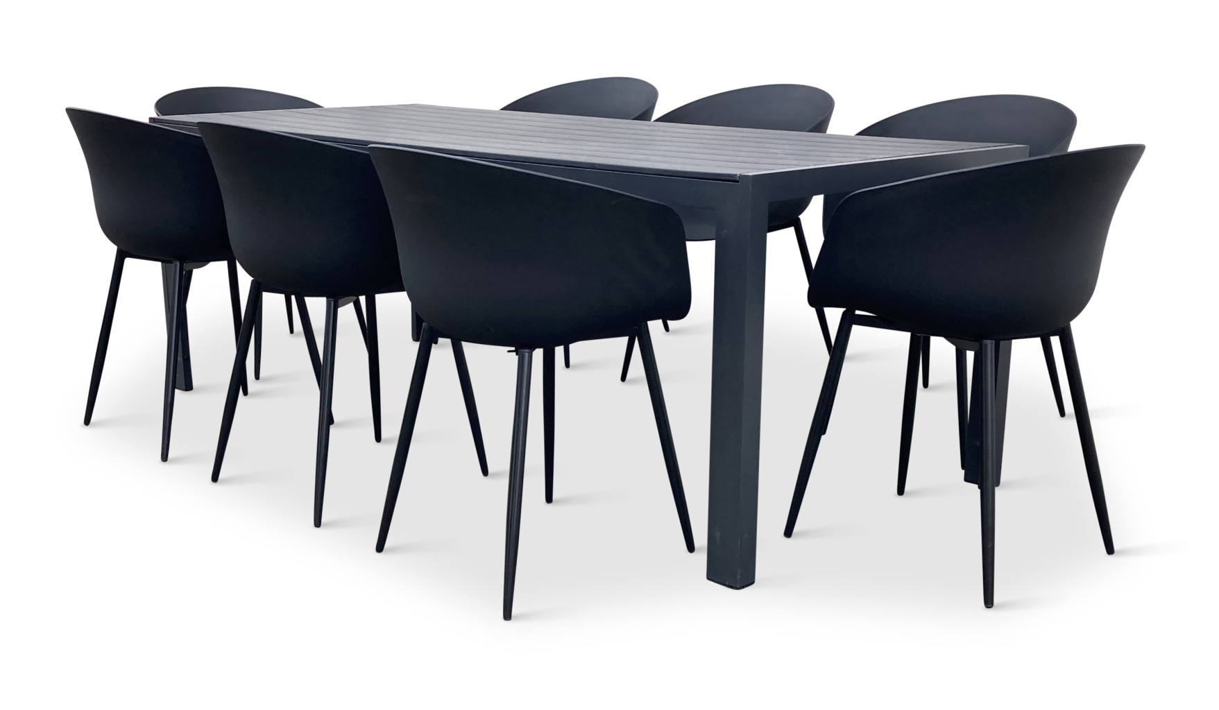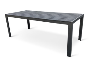 Sestava zahrnuje krásný a lehký stůl vyrobený z materiálů, které nevyžadují zvláštní údržbu. Konstrukce z hliníku ošetřeného proti rzi, deska stolu z artwoodu a adaptéry u nohou pro větší stabilitu. Umělé dřevo artwood v černé barvě věrně imituje strukturu a vzhled dřeva. Ani po několika sezónách neztratí svůj původní vzhled a stabilitu. Klasické tvary a černé provedení stolu.