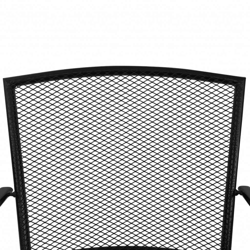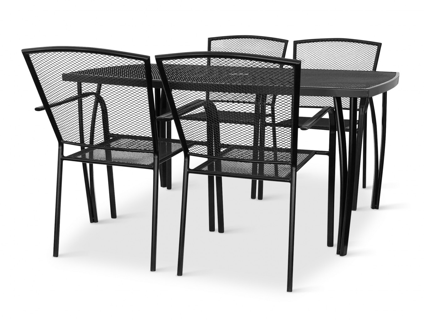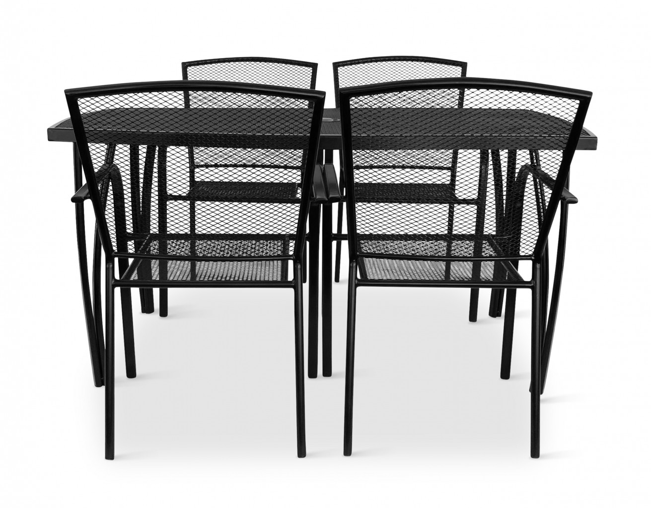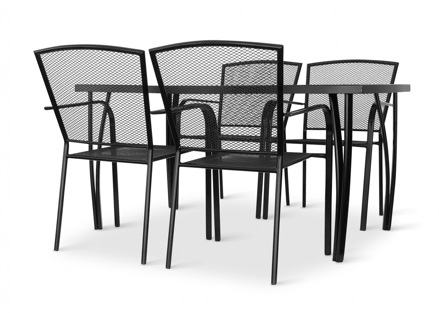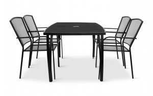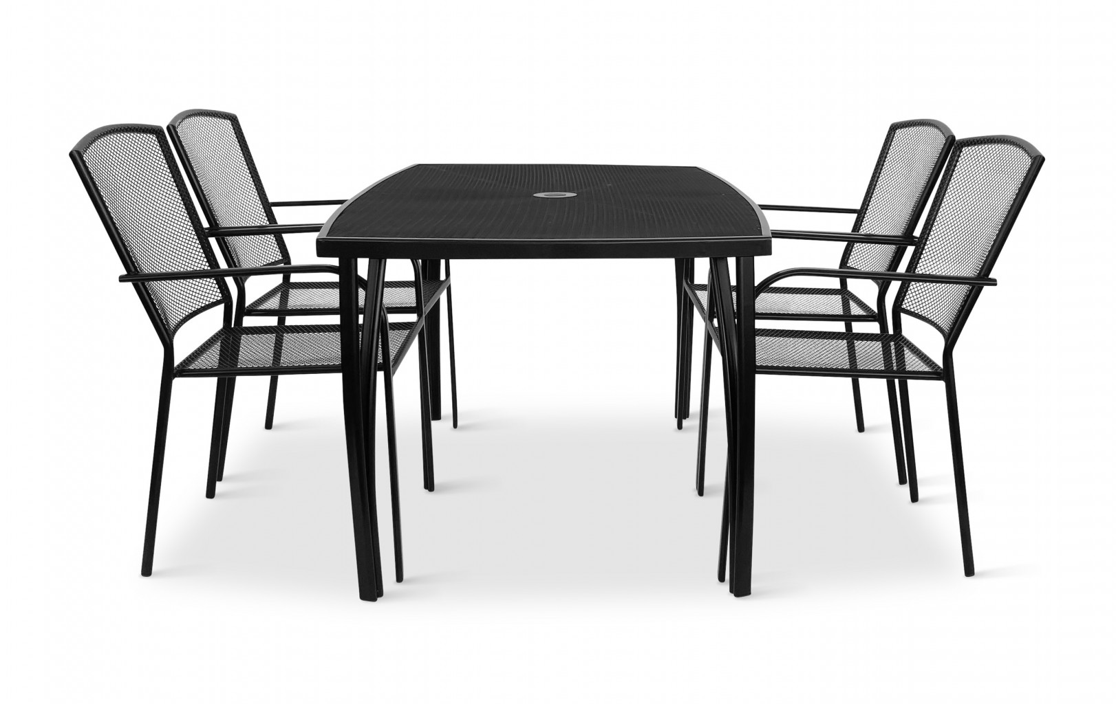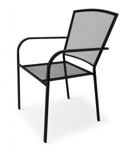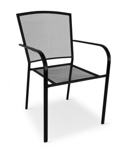 Jídelní stůl doplňují odolné stohovatelné židle vyrobené z kovu. Pevná ocelová konstrukce židle byla povrchově ošetřena proti rzi. Sedák i opěrku zad tvoří výplet z kovu. Jednoduchý, zajímavě vypadající design židle s područkami. Židli lze stohovat, což oceníte zejména při uskladnění po sezóně. Židle naskládáte na sebe a šetříte místo při uložení. Odolná vůči povětrnostním vlivům. Hodí se do venkovních i vnitřních prostor.