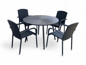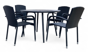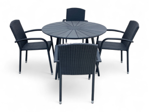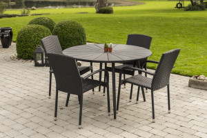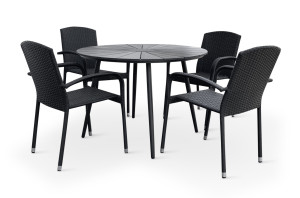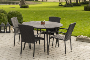 Jídelní stůl doplňují zahradní židle s ocelovou konstrukcí vypletenou umělým ratanem, které se hodí prakticky kamkoliv. Umělý ratan představuje velmi odolný materiál, který dobře snáší jakékoliv povětrnostní podmínky. Na slunci se nevyšisuje a po dlouhou dobu si uchovává svůj vzhled. Pro delší životnost byla ocelová konstrukce židle ošetřena proti rzi. Stohovatelné, téměř bezúdržbové židle s vyztuženým sedákem, který unese těžší váhy i po delší dobu.