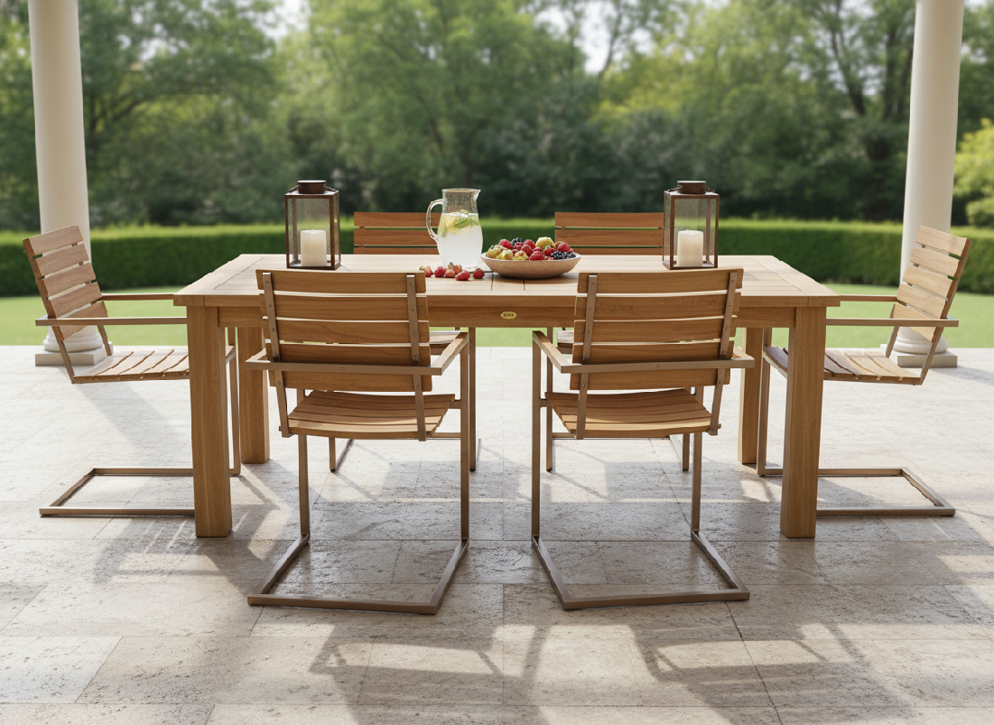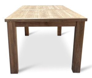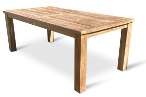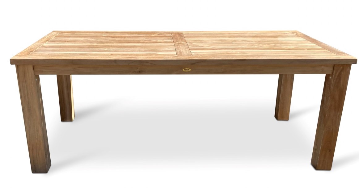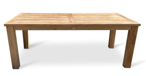 Sestava zahrnuje zahradní stůl z teaku z řady Garden. Hranatý teakový robustní stůl o rozměrech 200 x 100 cm. Obdélníkový stůl Garden III je svým rozměrem optimální pro 4-6 osob. Masivní nohy mu dodávají maximální stabilitu. S otvorem pro slunečník uprostřed desky stolu. Dodáváno včetně dřevěné záslepky.