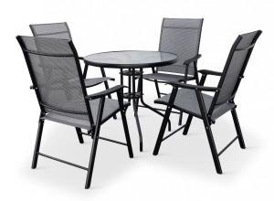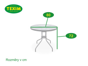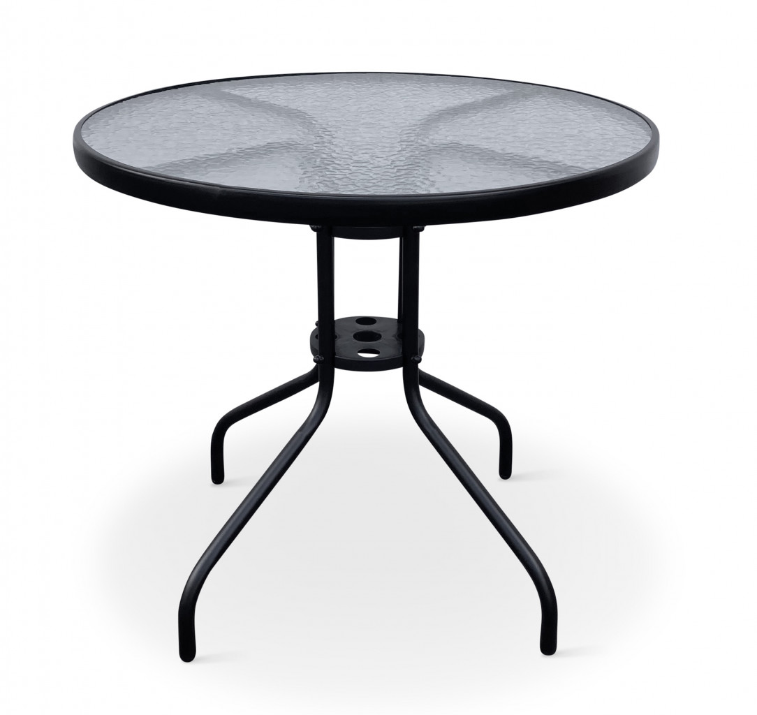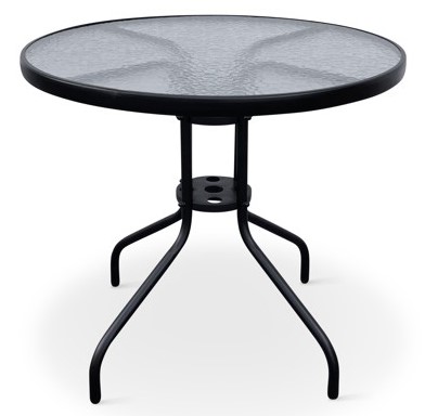 Sestava zahrnuje stabilní stůl s kovovou konstrukcí z oceli a skleněnou transparentní deskou. Kulatá deska stolu vyrobená z tvrzeného skla poskytne místo až pro 4 osoby. Kovové části stolu byly ošetřeny proti rzi. Stůl je vyroben z téměř bezúdržbových omyvatelných materiálů, které odolávají povětrnostním vlivům. Praktický stůl s menší kulatou deskou o průměru 80 cm, který je ideální pro malé venkovní prostory, kde jste omezeni místem.