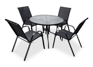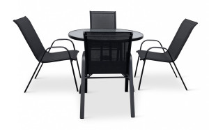 Jídelní stůl doplňují odolné stohovatelné židle s ocelovou konstrukcí a vzdušnou textilií. Vzdušná textilie, ze které je vyroben sedák, je ideální na léto a díky inteligentnímu tvarování velice pohodlná. Židle lze jednoduše naskládat na sebe a nezaberou vám mnoho místa při uložení. Vhodná pro nekomerční použití. Pro delší životnost neskladovat židle ve vlhkých prostorách a nenechávat na dešti.