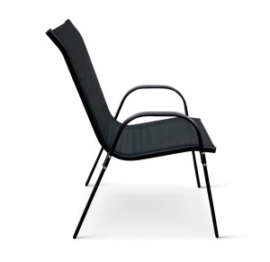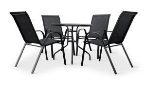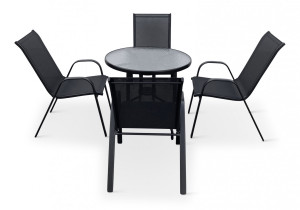 Jídelní stůl doplňují odolné stohovatelné židle s ocelovou konstrukcí a vzdušnou textilií. Vzdušná textilie, ze které je vyroben sedák, je ideální na léto a díky inteligentnímu tvarování velice pohodlná. Židle lze jednoduše naskládat na sebe a nezaberou vám mnoho místa při uložení. Vhodná pro nekomerční použití. Pro delší životnost neskladovat židle ve vlhkých prostorách a nenechávat na dešti.