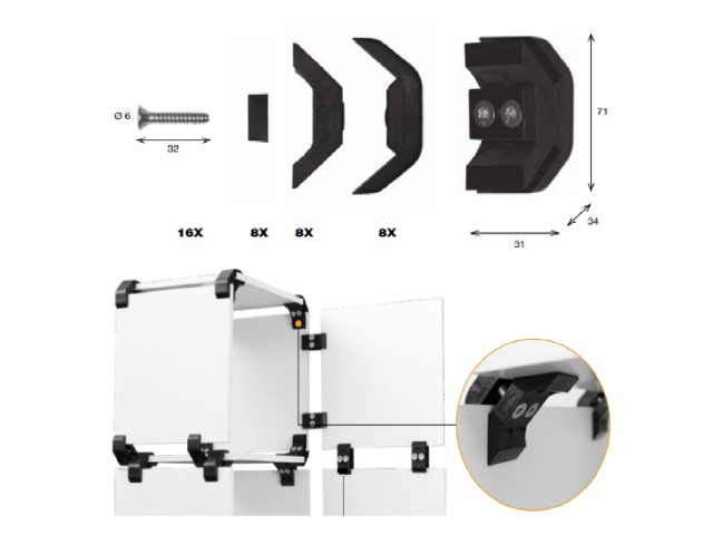 Sada pro spojování dřevěných, skleněných nebo akrylátových desek, jednoduchá a rychlá montáž, možné sestavovat police vertikálně i horizontálně, pokud se rozhodnete můžete sestavu kdykoliv jednoduše změnit, moderní design, vhodné kamkoliv v domácnosti od ložnice až po dílnu, barevné a tvarové variace záleží jen na vás