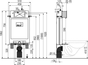 Nosná konzola zaručuje vysokou tuhost připojení WC ke stěně; Rozměry a konstrukce konzoly zjednodušují instalaci systému; Konstrukce polystyrenové izolace nádržky zjednodušuje zazdívání, zabraňuje rosení na povrchu nádržky a tlumí prostup vibrací z nádržky do stavební konstrukce; Duální splachování nezávisle nastavitelné s hygienickou rezervou; Úsporné splachování – 2 l malé spláchnutí, 4 l velké spláchnutí; Možnost vestavby oddáleného nebo senzorového splachování; Kompatibilní se všemi ovládacími tlačítky Alcaplast; Nádržka je vyrobena z jednoho kusu, čímž je zaručena 100% nepropustnost; Přívod vody zezadu/shora uprostřed; Servisní práce bez použití nářadí; Kryt servisního otvoru zjednodušuje montáž a brání pronikání vlhkosti a nečistot; Montážní výška 1062 mm; Montážní hloubka nastavitelná v rozmezí 20–95 mm; Stavební hloubka 125 mm; Nutné podezdění nebo použití noh M90; Materiál nosné konzoly: kov ošetřený práškovou barvou