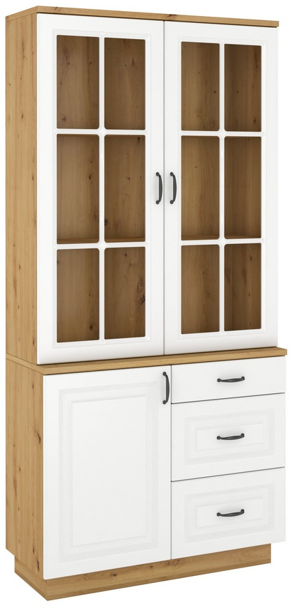 Dotaz na produkt Na splátky ještě dnesNádstavec dvoudveřový ke komodě v moderním provedení venkovského stylu. Korpus je vyroben z kvalitního lamina v barvě dub artisan, prosklená dvířka jsou vyrobena z desky MDF v barvě bílé. Úchyty jsou kovové černé. Doporučujeme kombinaci tohoto nádstavce s komodou šíře 100 cm. Dodáváme v demontovaném stavu.