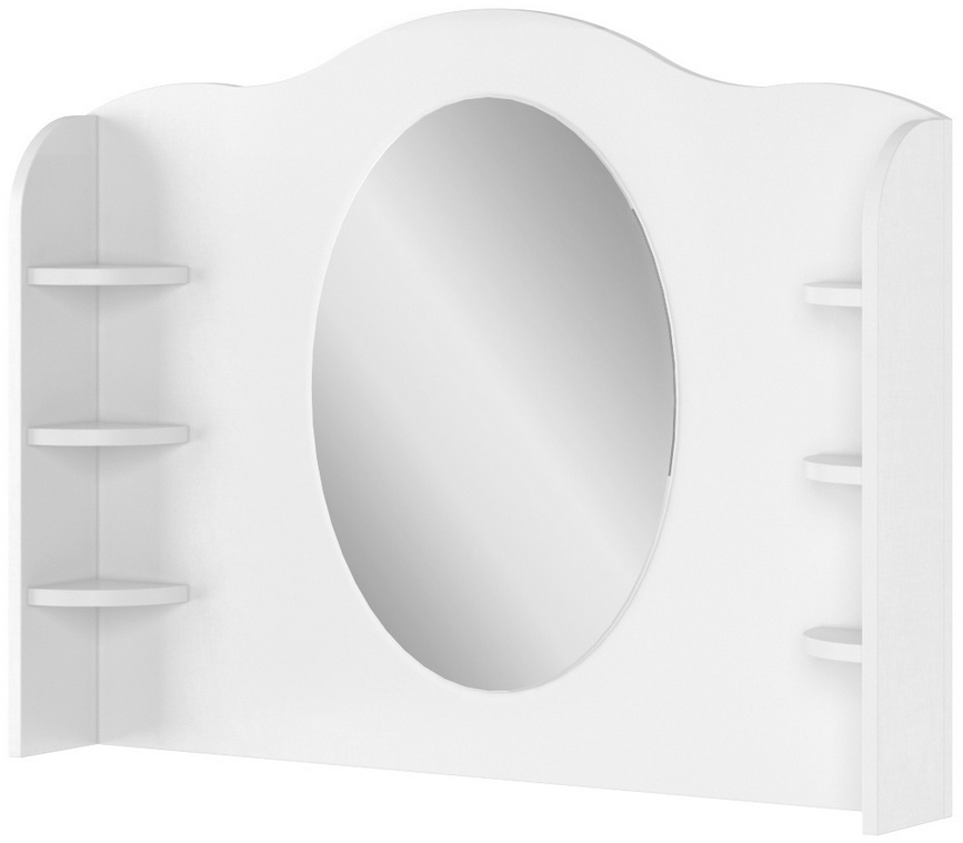 Nádstavec se zrcadlem. Tento elegantní nábytek dodá romantickou atmosféru pokojíčku malé princezny i větší slečny. Nástavec je vyroben z desky LTD v kombinaci s MDF v barvě bílé. Nástavec je možné kombinovat s psacím stolem 03 nebo komodou 05, upevňuje se úchytkami v zadní části stolu (komody). Dodáváme v demontovaném stavu.