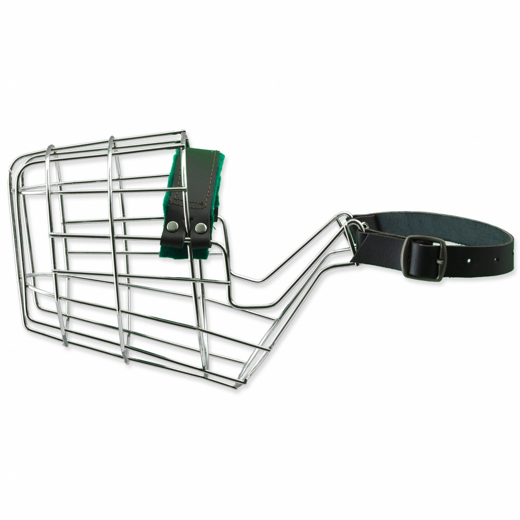 Dotaz na produktKovový náhubek s koženými řemínky na zapínání.