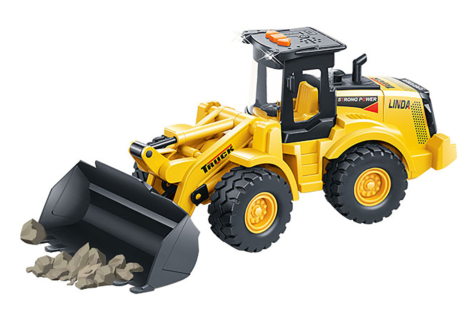 Dotaz na produktNakladač na setrvačník s efekty. Rozměry 35x11x13 cm. S pohyblivou radlicí. Na setrvačník. Vydává světelné a zvukové efekty. Aktivace tlačítky na střeše. 3xAG13 baterie, součástí balení.