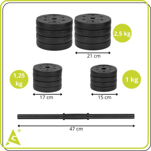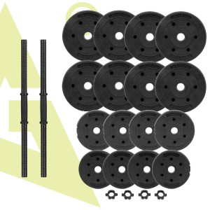 Součástí sady je pestrá skladba 16 kotoučů, která umožňuje flexibilní kombinování hmotností. K dispozici jsou kotouče o hmotnosti 1 kg, 1,25 kg a 2,5 kg, takže si zátěž snadno nastavíte přesně podle svých potřeb. Ideální řešení pro začátečníky i pokročilé, kteří chtějí mít plnou kontrolu nad svým tréninkem.