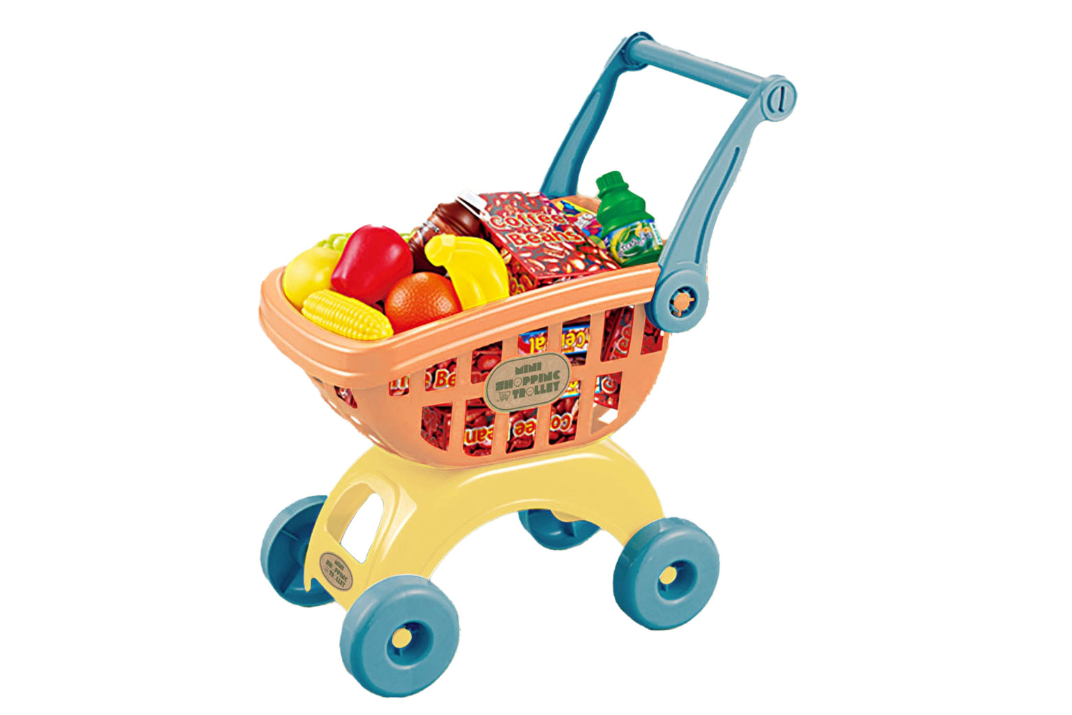 Dotaz na produktNákupní vozík s potravinami Bioplastic. Obsah balení - nákupní vozík, ovoce, zelenina, džus, brambůrky, cookies. Velikost 41,5 cm.