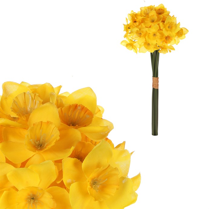 Dotaz na produktUmělá kytice narcisů v zářivě žlutém odstínu je vyrobena z textilu, který věrně napodobuje přirozenou strukturu květů. Svazek je pevně svázán a disponuje dlouhými zelenými stonky, které umožňují snadné aranžování do vázy nebo dekorativních kompozic. Kytice přináší do interiéru svěží a jarní atmosféru bez nutnosti péče o živé rostliny. Vynikne samostatně i jako součást větších dekorací.