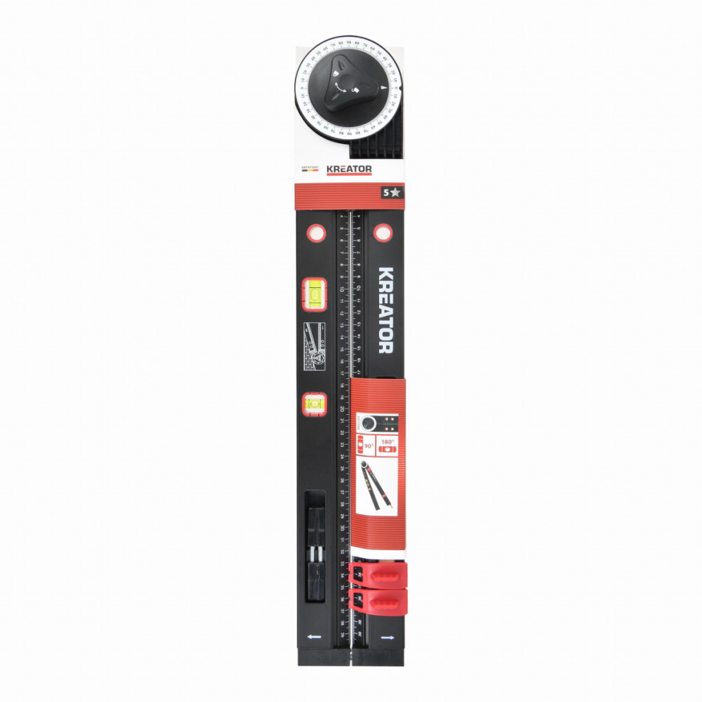 Dotaz na produktTento multifunkční úhloměr KRTH75001 z naší řady Kreator umožňuje měřit a označovat vnitřní, vnější nebo protilehlé úhly. Díky délce 515 mm a vybavení vertikální i horizontální vodováhou je tento úhloměr praktickým všestranným multifunkčním měřicím nástrojem.
