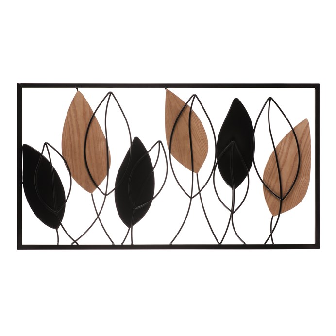 Dotaz na produkt Na splátky ještě dnesTato nástěnná dekorace s listy v rámu spojuje eleganci kovu a přírodní krásu dřeva. Černý obvodový rám a listy v kombinaci hnědé a černé barvy vytvářejí sofistikovaný a moderní vzhled, který skvěle doplní každou stěnu. Kovové drátky a dřevěné prvky dodávají dekoraci nevšední texturu a vizuální zajímavost. Ideální pro oživení interiéru, na pověšení do obývacího pokoje, chodby nebo pracovny.