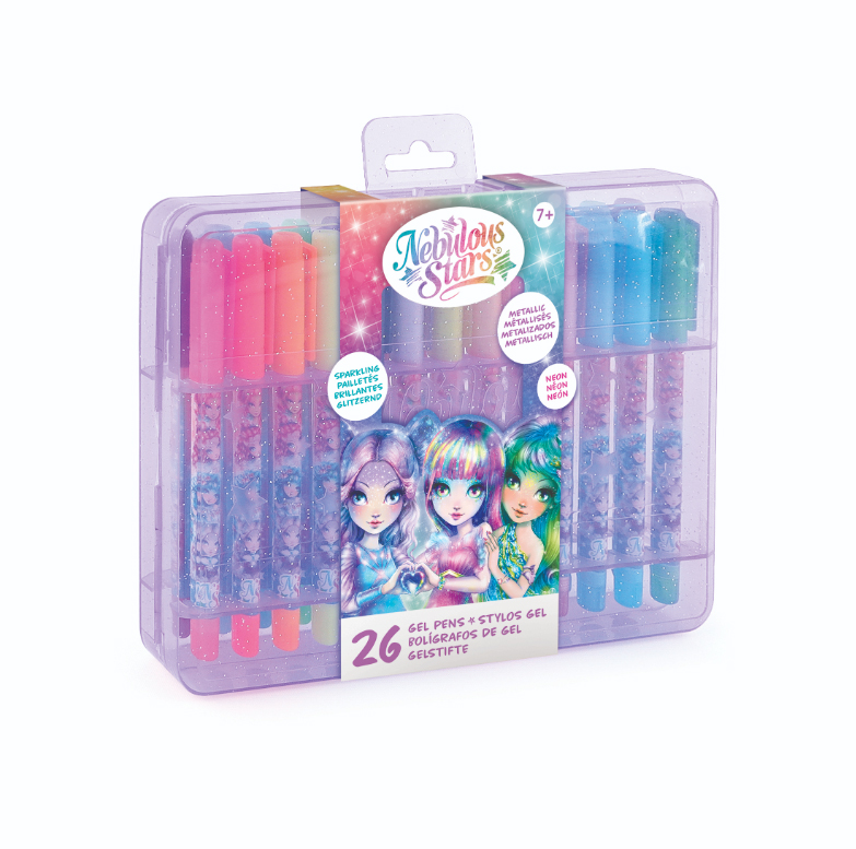 Dotaz na produktNebulous Stars Gelová pera set. Plastový kufřík, který obsahuje 26 gelových per. Třpytivé neonové barvy. 9 per s třpytivým gelem, 8 metalických per, 8 neonových per, 1 černé gelové pero. Display box - 6 ks.