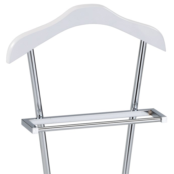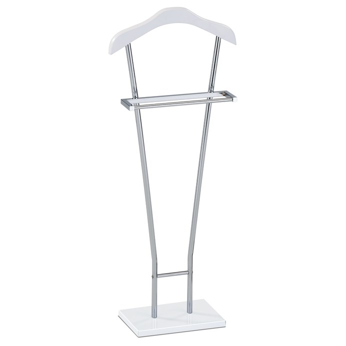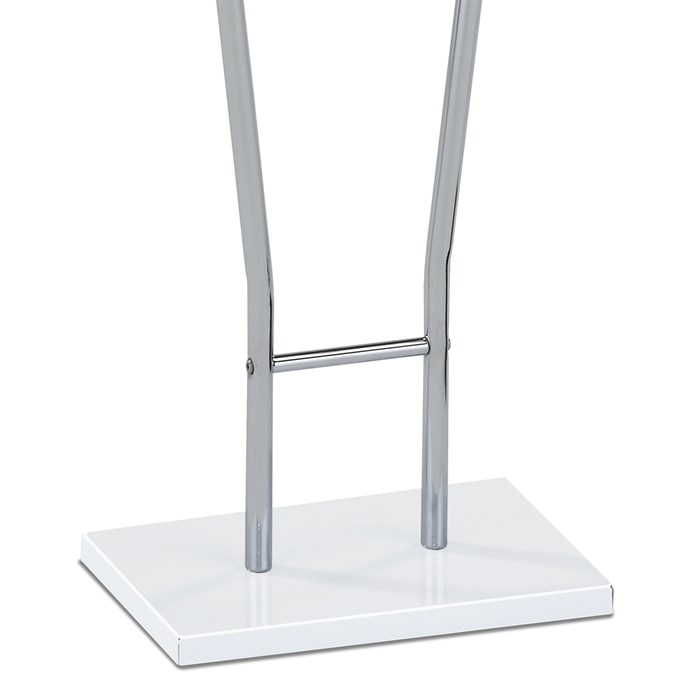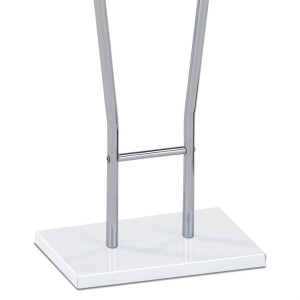 Dotaz na produktPraktický němý sluha v moderním designu. Konstrukce je kombinací kovových trubek s kovovou podestou a masivního ramene. Povrchová úprava je v bílém matném laku a chromu. Výška 110 cm Vám umožní zavěšení oblečení i doplňků bez pomačkání. Nosnost stojanu je až 6 kg, hmotnost necelé 4 kg. Proto je jednoduše přenositelný a lze ho umístit podle momentální potřeby i nálady. Stylem a jednoduchostí se hodí do jakéhokoli interiéru. Využití je nepřeberné, záleží jen na Vás.