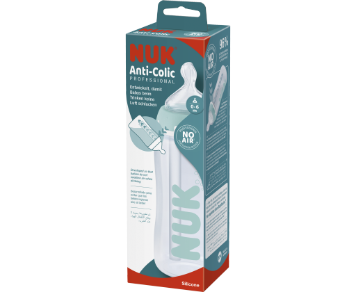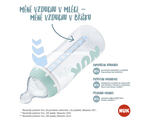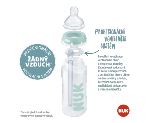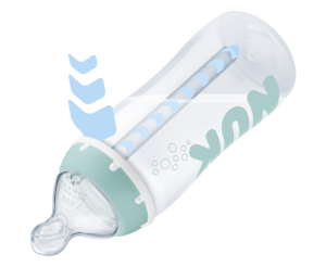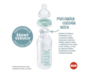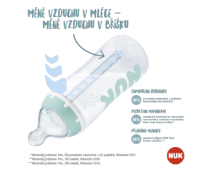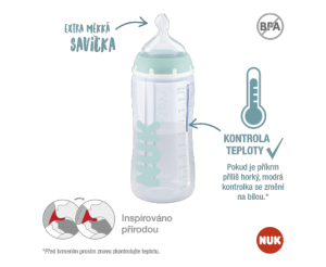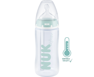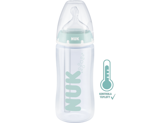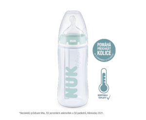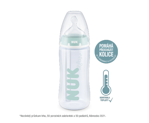Dotaz na produktNUK FC+ Anti-colic láhev s kontrolou teploty 300 ml. Díky profesionálnímu ventilačnímu systému se při krmení dostane do bříška miminka méně vzduchu. Tajemstvím je profesionální ventilační systém, který ještě efektivněji pomáhá předcházet polykání vzduchu. Jedná se o inovativní kombinaci ventilačního otvoru a vzduchové trubičky. Ventilační otvor zajistí, že se savička během krmení nesmršťuje. Zabudovaná vzduchová trubička směruje vzduch z ventilačního otvoru přímo na dno lahvičky, a to tak, že vzduchové bubliny nepřicházejí do kontaktu s obsahem lahvičky. Tím se zabrání hromadění vzduchu v mléce. Zabudovaný indikátor kontroly teploty změní barvu, pokud je obsah láhve příliš horký. Modrá barva indikátoru se změní na bílou. Přirozený a vhodný tvar pro dětskou čelist, savička z obzvlášť měkkého silikonu, 0-6 měsíců, velikost M (středně velký otvor = pro dětskou výživu). Originální tvar savičky NUK připomíná tvar matčiny bradavky během kojení. Poskytuje jazyku a čelisti dostatek prostoru a děti tento pocit milují. Savička je klinicky testována. Vyrobeno z vysoce kvalitního polypropylenu (PP), neobsahuje BPA.