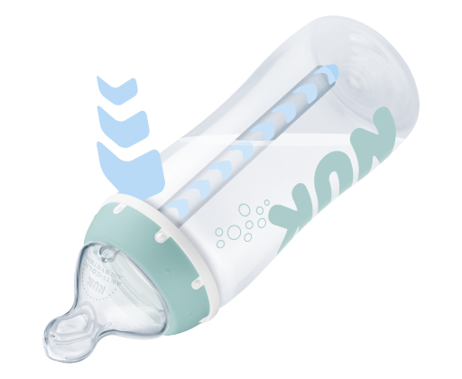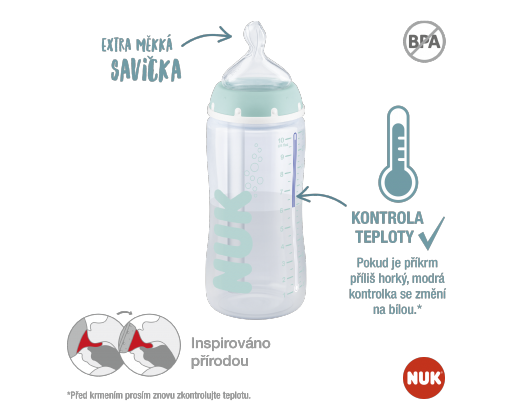 Indikátor teploty NUK pomáhá zajistit, aby obsah láhve nebyl při krmení příliš horký. Je-li obsah příliš horký, indikátor teploty na láhvi zbělá. Podávaná výživa by měla mít optimálně tělesnou teplotu (37 °C = středně modrý odstín). Před krmením prosím znovu zkontrolujte teplotu.