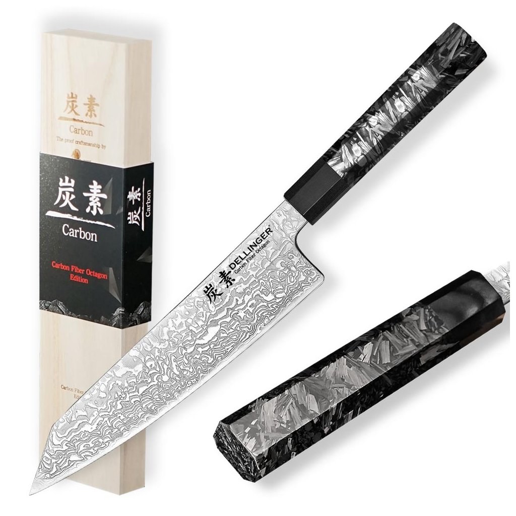 Dotaz na produkt Na splátky ještě dnesElegantní nůž šéfkuchaře inspirovaný japonskou tradicí. Dellinger Chef/Kiritsuke 215 mm Carbon Fiber Octagon® kombinuje výjimečný design s VG10 jádrem (HRC 61±1) a osmihrannou karbonovou rukojetí pro maximální přesnost a pohodlí při krájení. Univerzální konstrukce umožňuje efektivní práci s masem, rybami i zeleninou.