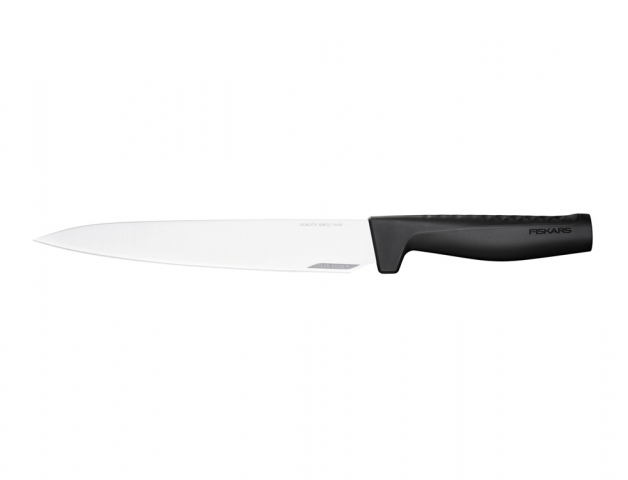 Dotaz na produktNůž s rovnou, dlouhou čepelí s hladkým ostřím je ideální pro krájení pečeně. Čepel nože je ze silné nerezové ocelové planžety. Ostří je zhotovené revoluční technologií LZR-EDGE. Ta umožňuje, aby nůž zůstal ostrý 4krát déle než standardní nože. Držadlo nože je ergonomicky tvarované s jedinečným 3D vzorem, který zajišťuje perfektní držení. Výška: 420 mm, délka: 25 mm, šířka: 90 mm, hmotnost: 110 g.