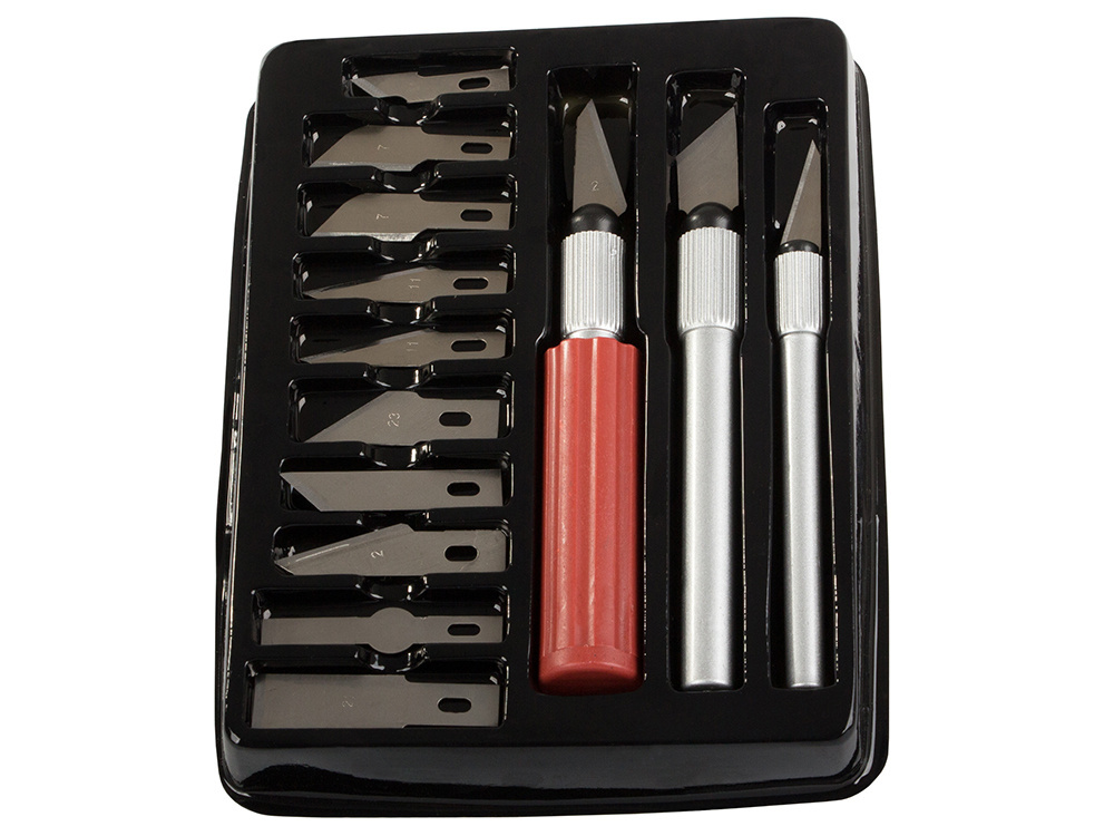 Dotaz na produktModelářský nůž sada modelovacích nožů skalpelový nůž Technická specifikace Velmi ostré čepele Čepele z oceli Tři rukojeti na výběr ze 13 čepelí Pouzdro s magnetickým proužkem Délka rukojeti: 10,5 cm Rozměry pouzdra: 15,5 cm x 6,5 cm x 3 cm Sada obsahuje : Zcela nová sada modelářských nožů v pouzdře.Originální balení