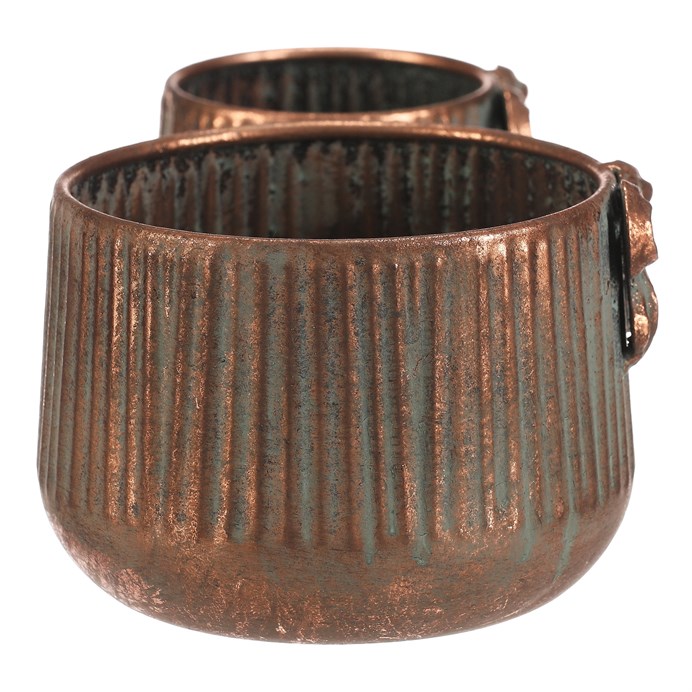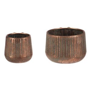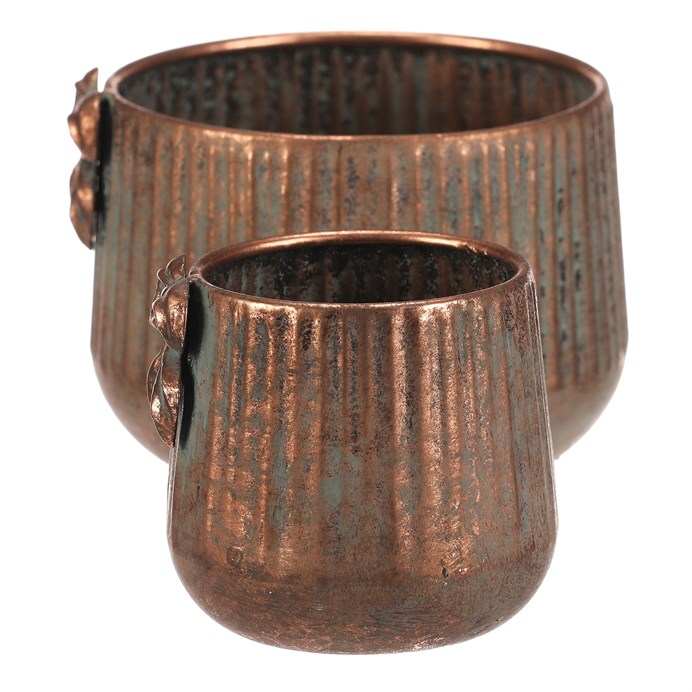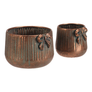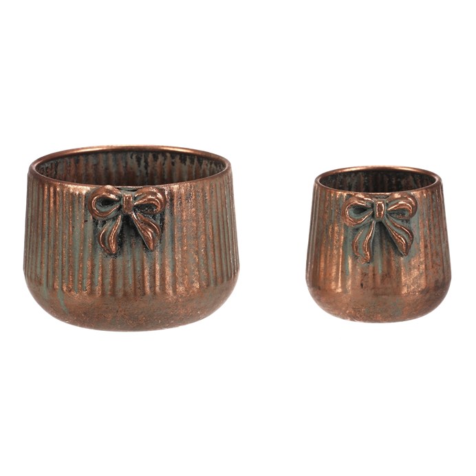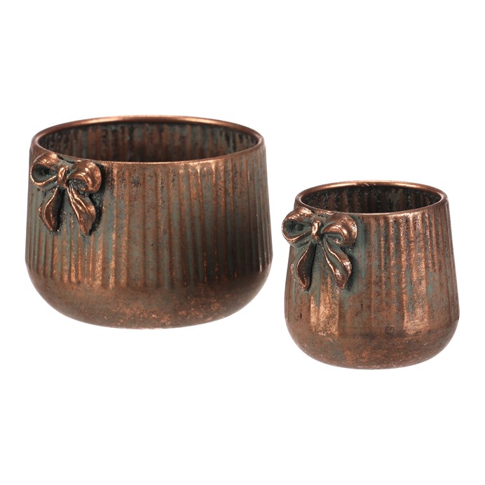 Dotaz na produkt Na splátky ještě dnesSada dvou kulatých kovových obalů v měděném odstínu zaujme jemným žebrováním a dekorativní mašlí na přední straně. Povrch s patinovým efektem dodává výrobkům rustikální charakter a vizuální hloubku. Obaly jsou vhodné pro umístění menších rostlin nebo jako stylový doplněk interiéru. Jejich pevné kovové provedení je navrženo pro dlouhou životnost a snadnou údržbu.