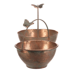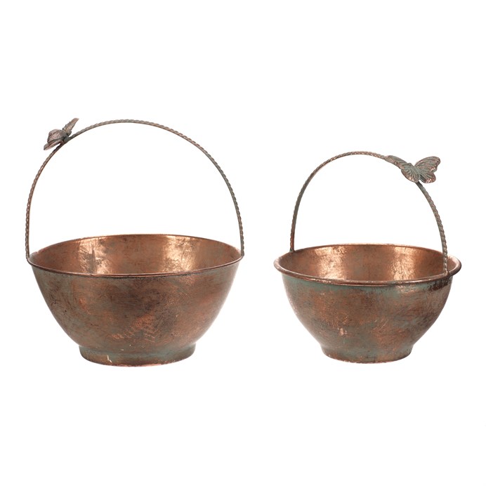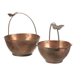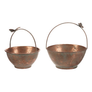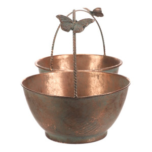 Dotaz na produktSada dvou kovových obalů v měděném odstínu zaujme svým rustikálním vzhledem a dekorativním detailem motýla na uchu. Obaly mají kulatý tvar s mírně rozšířeným okrajem a pevnou rukojetí, která usnadňuje přenášení. Povrch s patinou dodává výrobku autentický vintage efekt, který vynikne v interiérech i na zahradě. Jsou vhodné pro aranžmá květin, sušených dekorací nebo jako stylový úložný prvek. Díky kovovému provedení se snadno udržují a jsou navrženy pro dlouhou životnost.