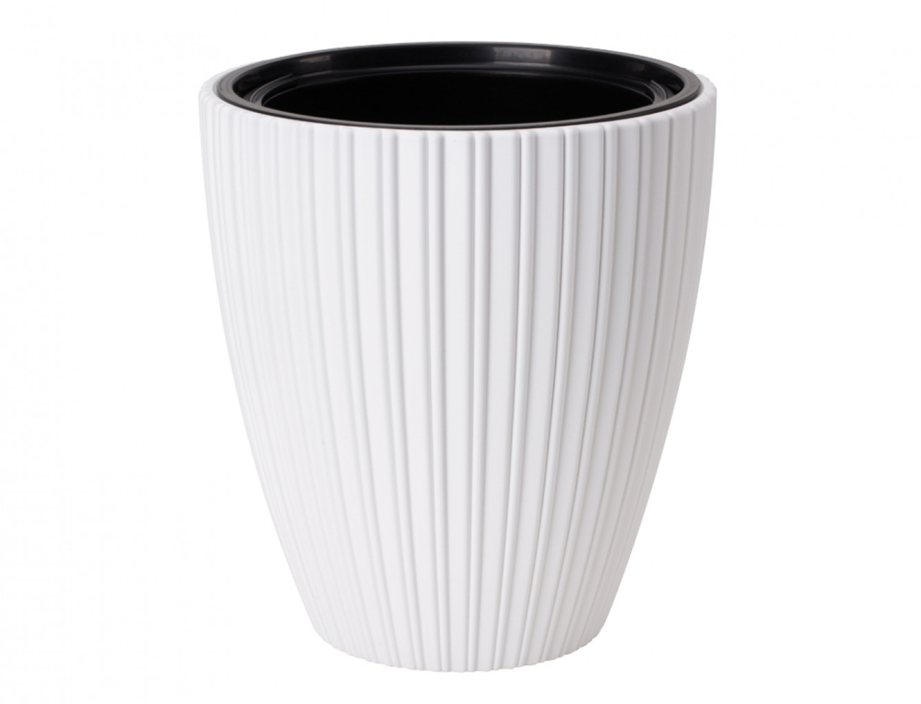 Dotaz na produktPlastový obal na květník s unikátním vzhledem, zdobený svislými pruhy po celém obvodu. Matný, kruhového půdorysu. Obal obsahuje vnitřní vyjímatelnou vložku. V trendy designu a barvě. UV stabilní, mrazuvzdorný. Vhodný do exteriéru i interiéru. Rozměry: průměr 30 cm, výška 32 cm. Barva: bílá.