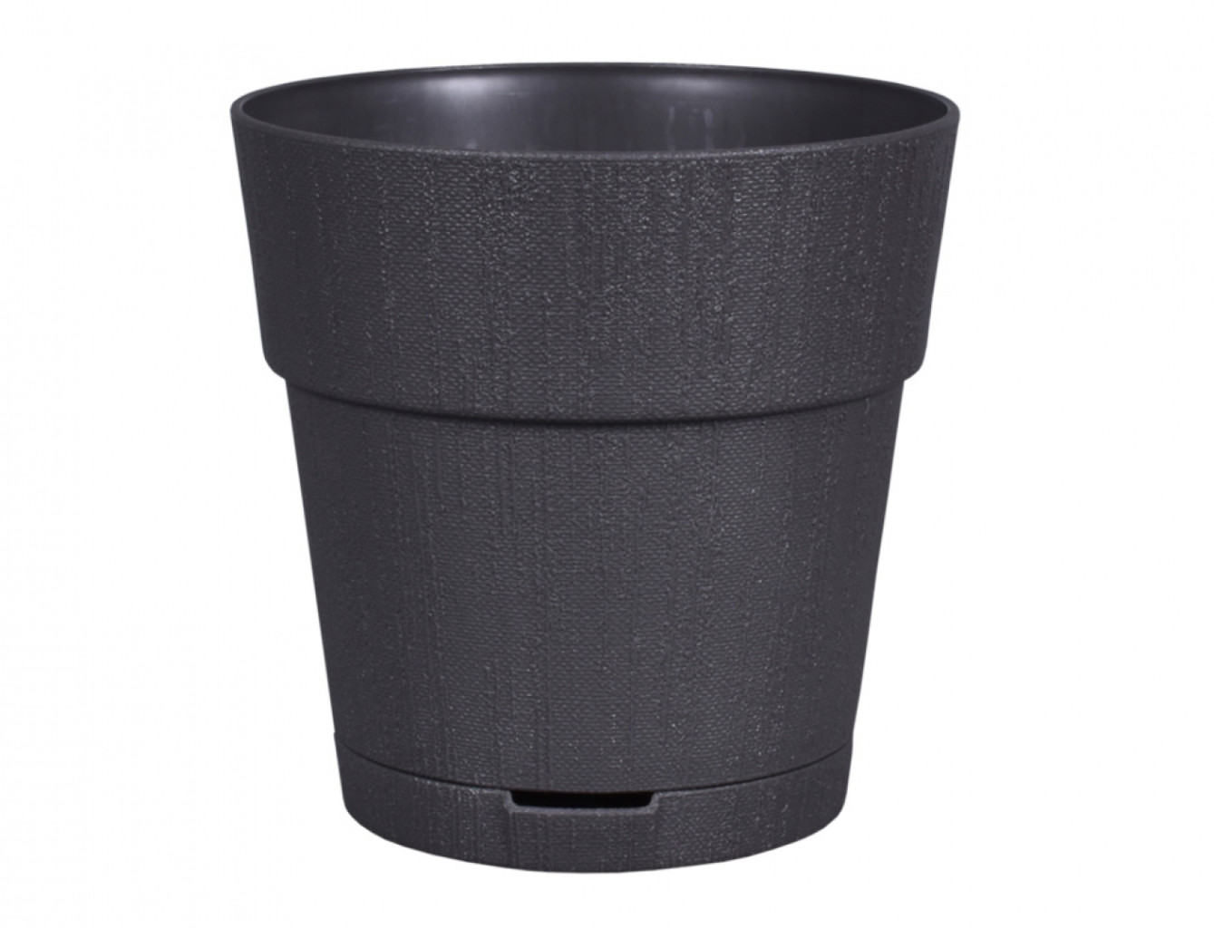 Dotaz na produktKvalitní samozavlažovací plastový obal s podmiskou opatřenou otvorem pro zalévání vhodný do interiéru i venkovních prostor. Italský design s okouzlující povrchovou úpravou po celé ploše z jedinečné kolekce vyrobené z recyklovaných plastů. Průměr: 25cm, výška: 25cm. Barva: antracit