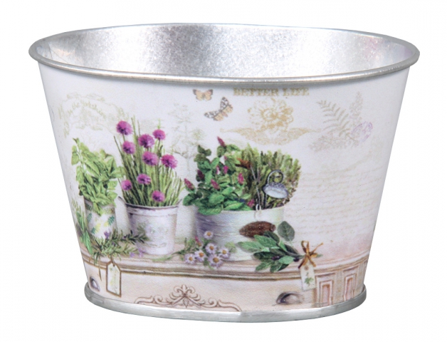 Dotaz na produktMalý plechový obal s potiskem bylinek v květináčích. Šířka: 8 cm, výška: 6 cm, hloubka: 10 cm.