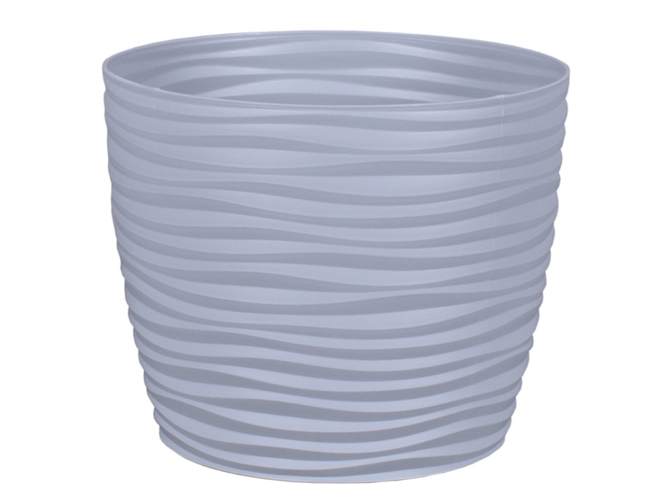 Dotaz na produktMatný plastový obal na květník s jemnými vlnkami po celém obvodu. Kruhového půdorysu. Neotřelý design a trendy barva osvěží každý interiér. Průměr: 17 cm, výška: 14 cm. Barva: šedá.
