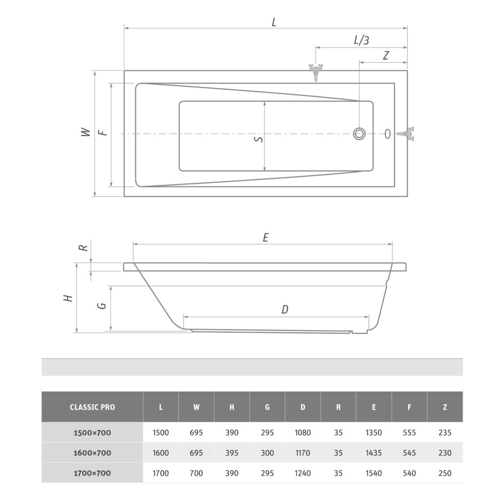 Obdélníková vana Roth Classic Pro 150x70 cm akrylát levá i pravá 9040000