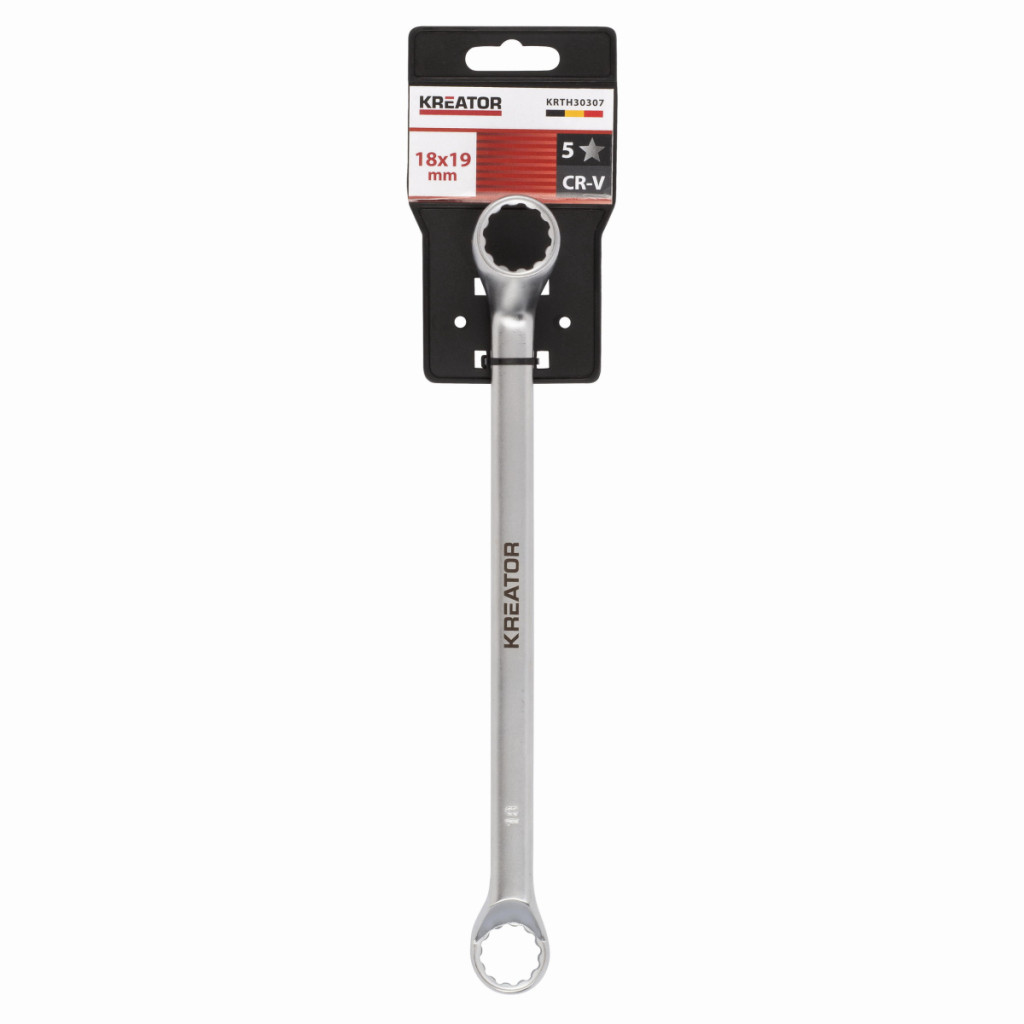 Dotaz na produktTento dvojitý očkový klíč KRTH30307 z naší řady Kreator má délku 205 mm a je vyroben z vysoce kvalitní chrom-vanadiového slitiny. Osazené kroužky zajišťují efektivnější přenos vyvíjené síly. Konce mají otvory různých velikostí. Jeden má velikost 18 a druhý 19 mm.