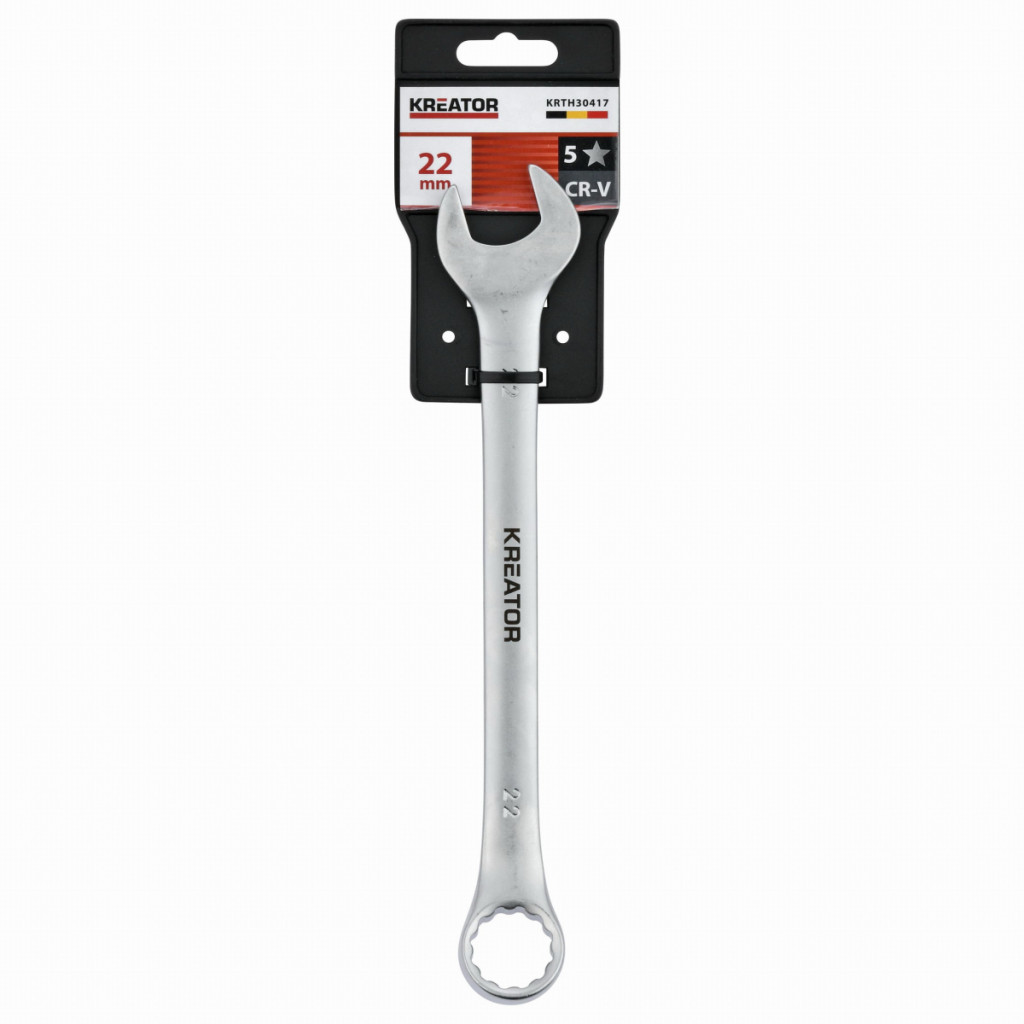 Dotaz na produktTento kombinovaný očko / otevřený klíč KRTH30417 od Kreator je vyroben z robustní chrom-vanadiové slitiny. Eliptický tvar dříku zajišťuje lepší přenos síly. Je dlouhý 255 mm a má průměr 22 mm.