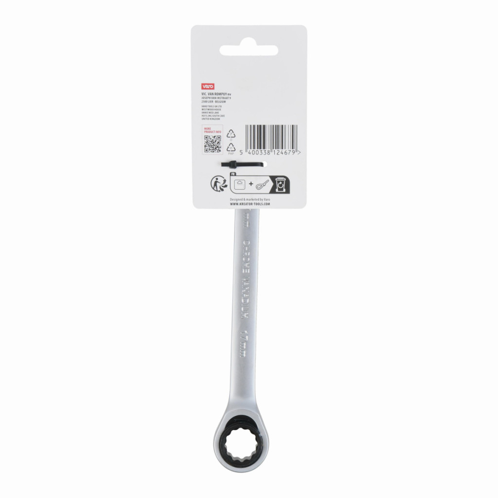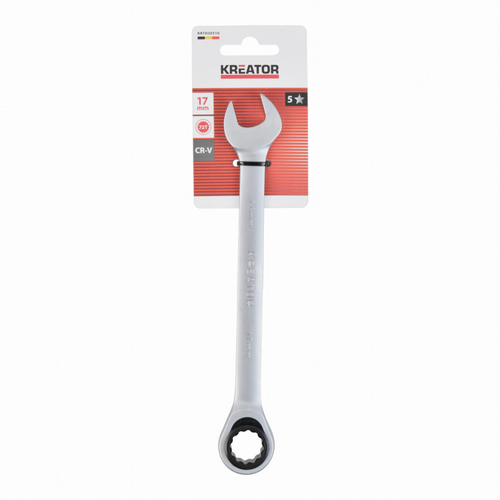 Dotaz na produktTento kombinovaný očko ráčna / otevřený klíč KRTH30510 od Kreator je vyroben z vysoce kvalitní chrom-vanadiové slitiny. Délka klíče je 222 mm a má průměr 17 mm. Očko je opatřeno kvalitním strojkem, který má 72 zubů.