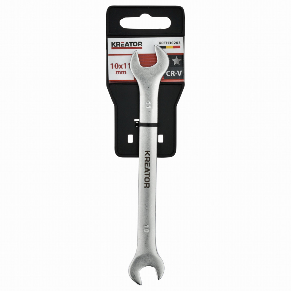 Dotaz na produktTento dvojitý otevřený klíč KRTH30203 značky Kreator má délku 150 mm a je vyroben z vysoce kvalitního chrom-vanadiového slitiny. Konce mají otvory různých velikostí. Jeden je široký 10 mm a druhý 11 mm.