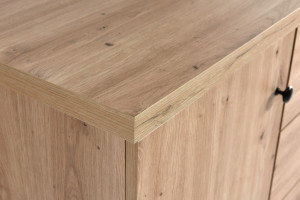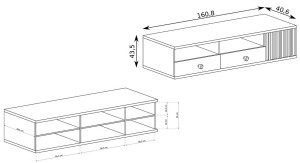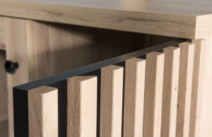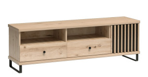 Dotaz na produkt Na splátky ještě dnesObývací sestava s netradičním provedením detailu dvířek s lamelami. Kolekce nábytku v sobě spojuje jednoduchost, originální vzhled a funkčnost. Barevné provedení je v kombinaci dub artisan/černá mat. Sestava se skládá z těchto položek (Š x V x H cm) - vitrína dvoudveřová se zásuvkami (86,4 x 201 x 40,6 cm), televizní stolek (160,6 x 53,4 x 40,6 cm a závěsný panel (80 x 148 x 3,2 cm). Nábytek je vyroben z kvalitního lamina ohraničeného ABS páskou, dekorační lamely jsou vyrobeny z desky MDF. Zásuvky jsou vybaveny kovovými pojezdy se systémem tichého dovírání. Sestava je doplněna kovovými nohami v černé barvě. Kolekce se skládá z mnoha prvků a tento široký výběr Vám zaručí sestavit si nábytek podle svých vlastních představ a přání. Možnost dokoupení LED osvětlení. Dodáváme v demontovaném stavu.
