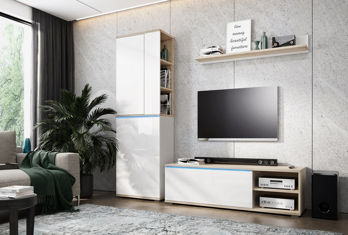 Dotaz na produkt Na splátky ještě dnesModerní obývací stěna je navržena podle nejnovějších trendů. Je zde použit moderní systém otevírání dvířek "PUSH", tzn. bez úchytek. Celkové rozměry stěny jsou 198 x 38 x 190 cm. Police má rozměry 115 x 17 x 17 cm, vitrína 60 x 190 x 32 cm a televizní stolek 138 x 42 x 38 cm (šířka/výška/hloubka). Dvířka i korpus jsou vyrobeny z LTD desky v kombinaci bílá mat a dub sonoma. Nabízíme možnost doobjednání LED osvětlení. Dodáváme v demontovaném stavu. DOPRODEJ!