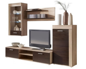 Moderní obývací stěna vhodná i do menších bytů. Tato sestava je vyrobena z kvalitního lamina. Sestava se skládá ( šířka/výška/hloubka ) - TV stolek ( 180 x 36 x 42 cm ), vitrína ( 60 x 109 x 30,5 cm ), komoda ( 60 x 111 x 30,5 cm ) a police ( 110 x 40 x 20 cm ). Korpus a část předních dvířek je barvy dub sonoma, dvířka jsou doplněna o barvu wenge. Tato stěna se prodává jako sestava, jednotlivé díly nelze koupit zvlášť. U vitríny je možnost dokoupení LED osvětlení. Dodáváme v demontovaném stavu.