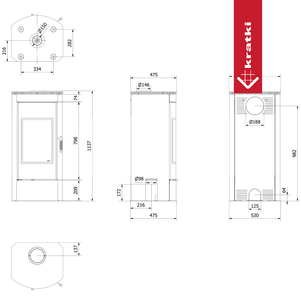 Ocelová kamna na dřevo KRATKI TITAN Panorama Ø 150 11 kW samozavírací