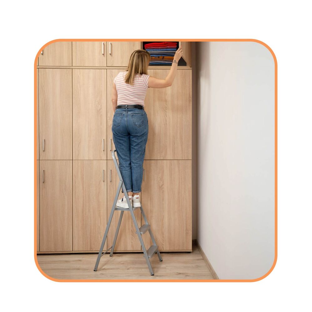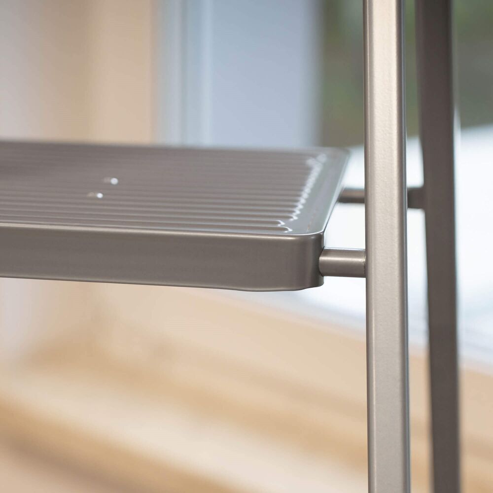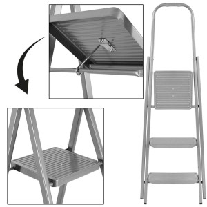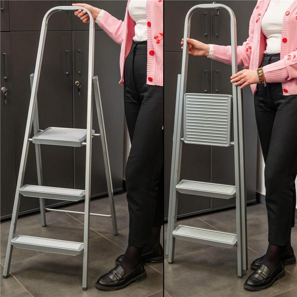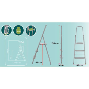 Praktické domácí schůdky se 3 stupni vynikají kompaktní skládací konstrukcí a bezpečnostním madlem pro snadné a bezpečné používání. Výška plošiny 63 cm, max. pracovní výška 263 cm, nosnost 150 kg. Protiskluzové nášlapy, plošina i nožičky zajišťují stabilitu při práci. Vysoce pevné a odolné provedení, moderní antikorozní úprava a nízká hmotnost dělají ze schůdků ideálního pomocníka do domácnosti.