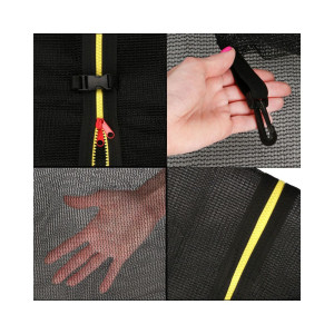 Vstupní otvor je zajištěn zipem a bezpečnostními přezkami proti nechtěnému otevření. Spodní strana je vybavena pružnými pásky s karabinkou pro snadné upevnění ke konstrukci trampolíny.