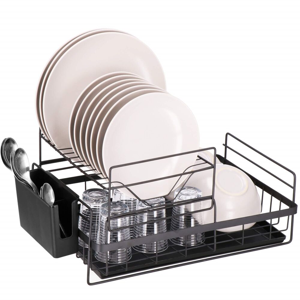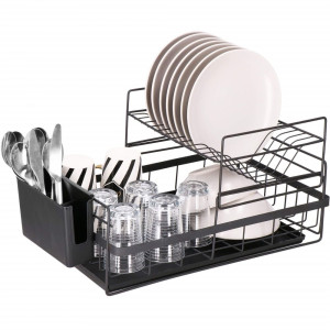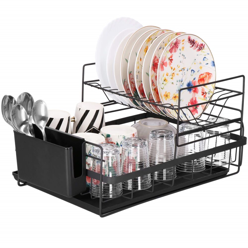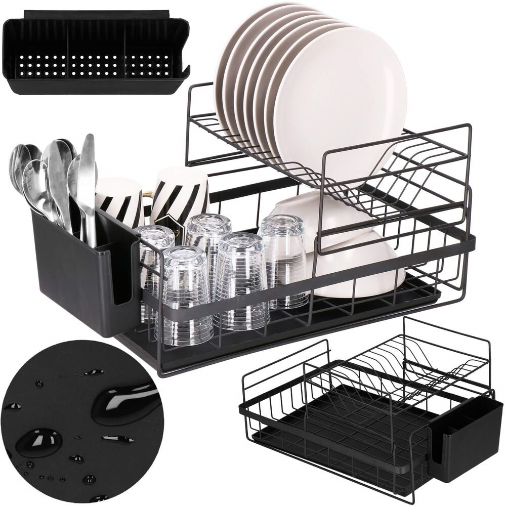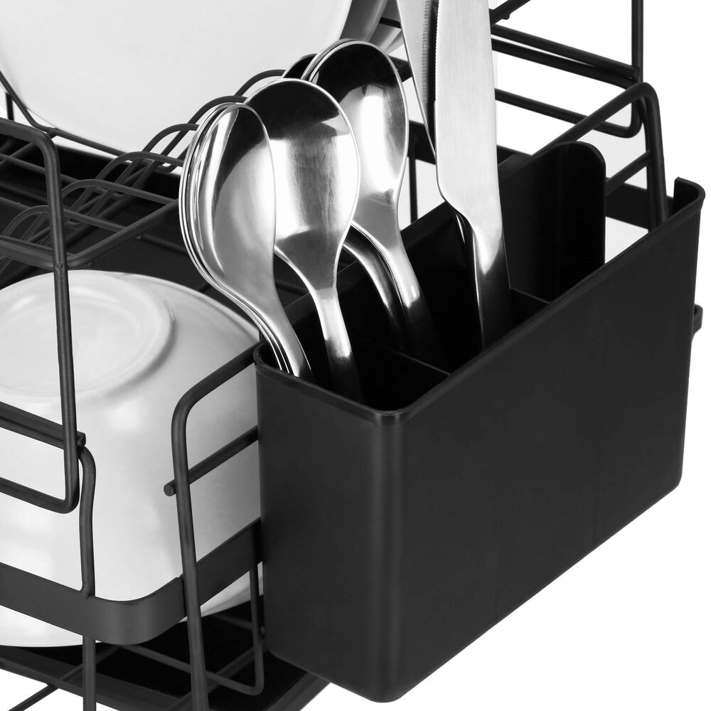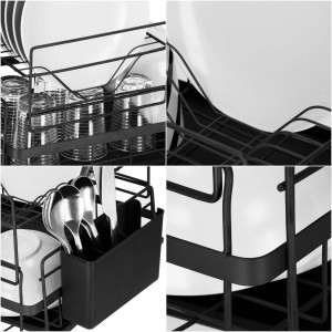 Odkapávač na nádobí nabízí víceúrovňové sušení díky praktickému dvoupatrovému provedení. Nerezový odkapávač s podnosem z matné oceli s černým práškovým nástřikem zaujme luxusním designem. Odnímatelný plastový podnos zachycuje vodu, zatímco plastová přihrádka na příbory a patro na talíře a misky usnadňují organizaci. Odkapávač se snadno čistí a poskytuje velkou kapacitu.